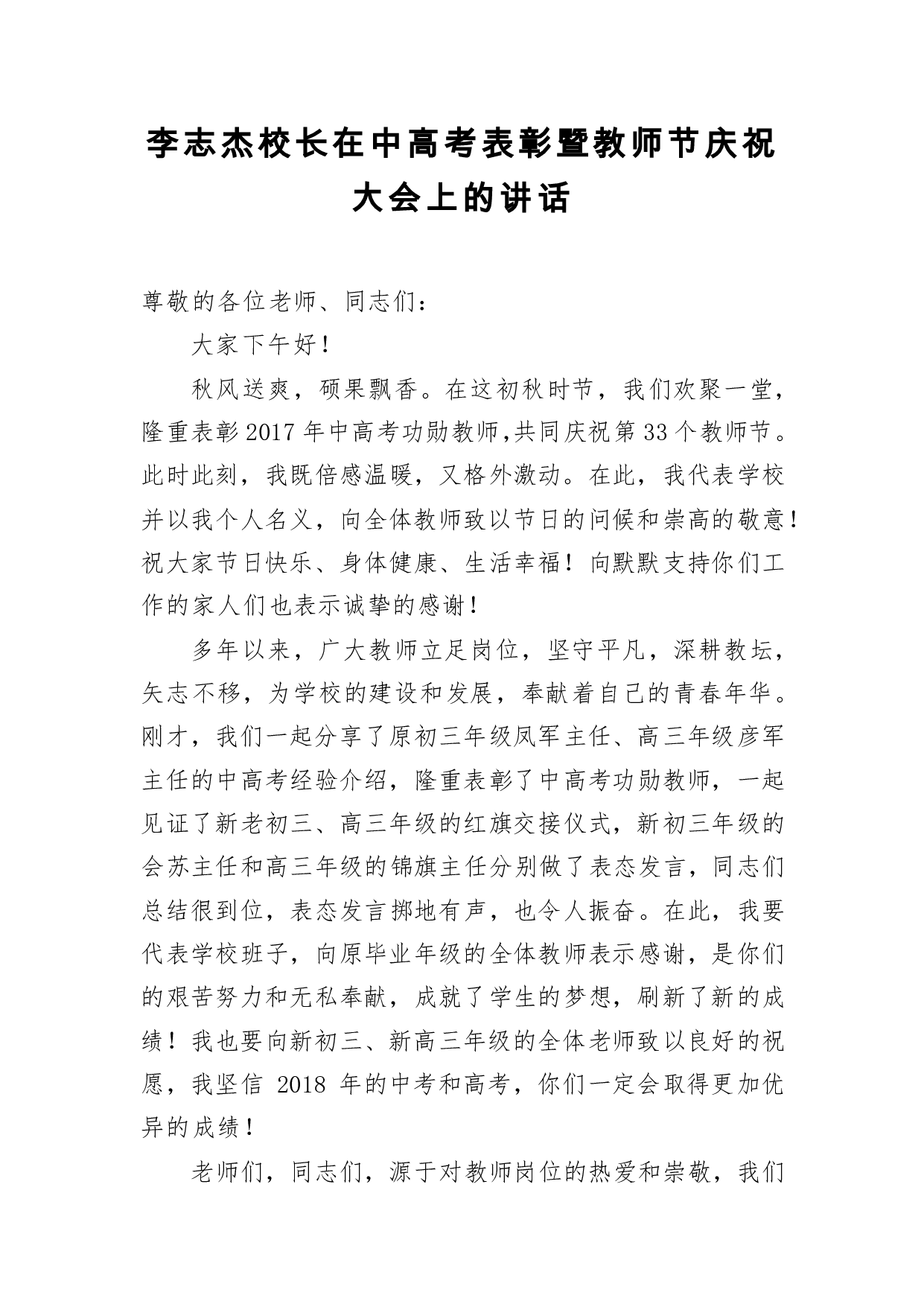 标题:教师节讲话:李志杰校长在中高考表彰暨教师节庆祝大会上的讲话