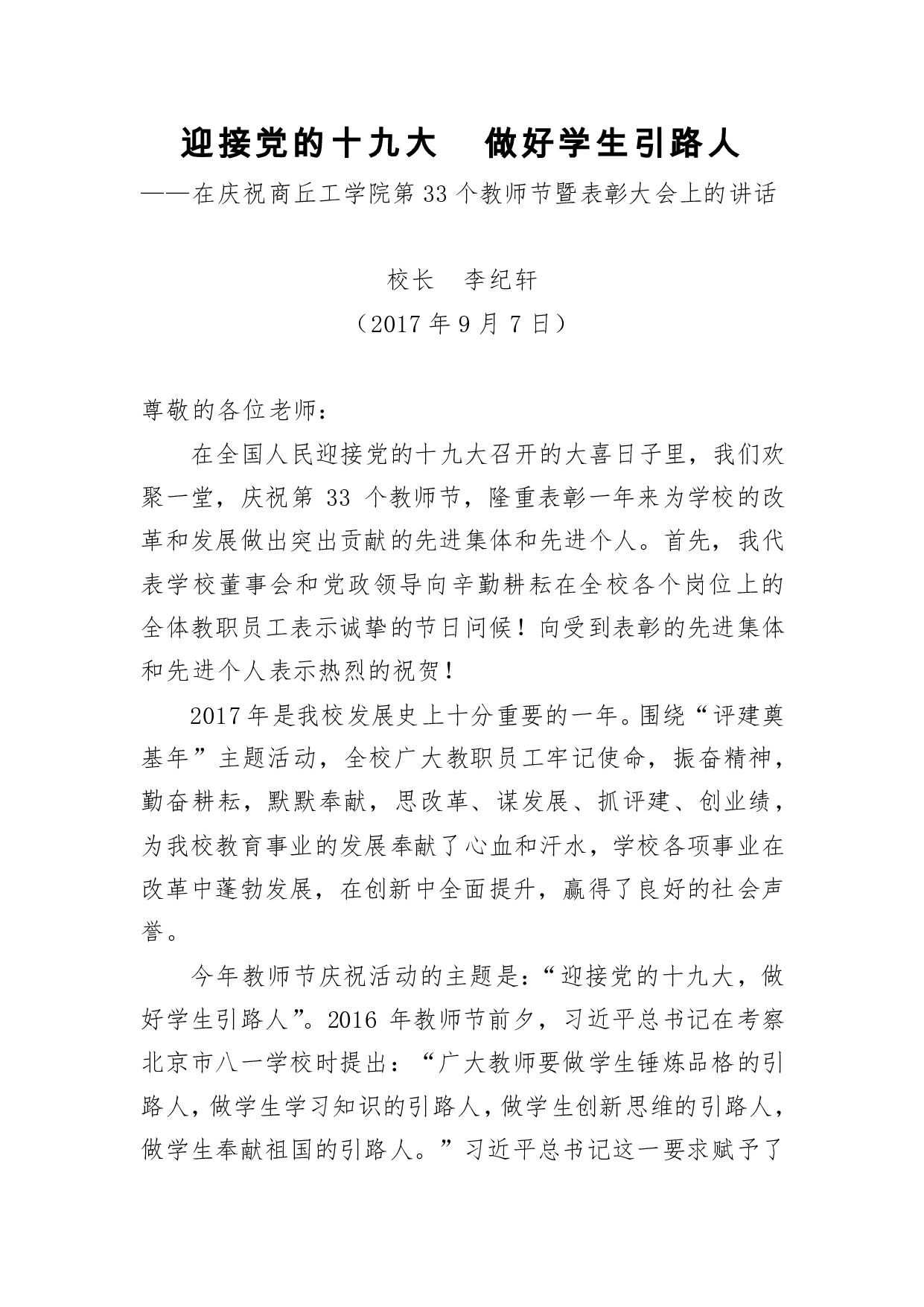 标题:教师节讲话:迎接党的十九大 做好学生引路人