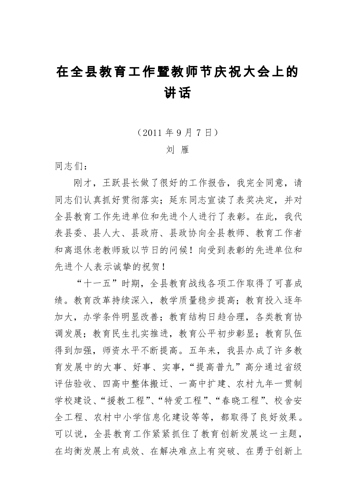 标题:教师节讲话:在全县教育工作暨教师节庆祝大会上的讲话