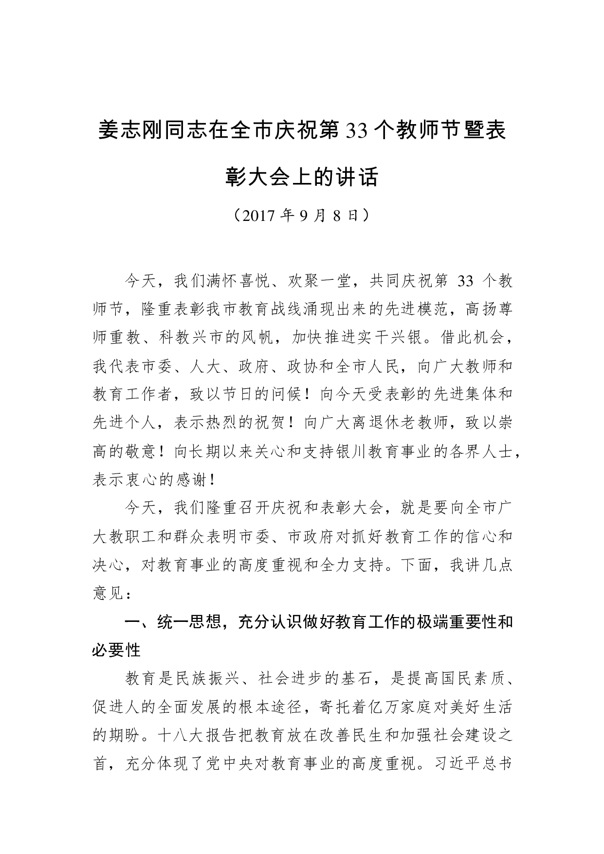 标题:姜志刚:在全市庆祝第33个教师节暨表彰大会上的讲话