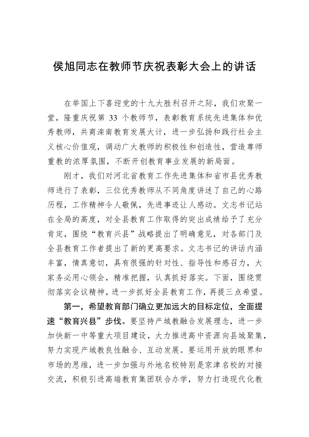 标题:侯旭:在教师节庆祝表彰大会上的讲话