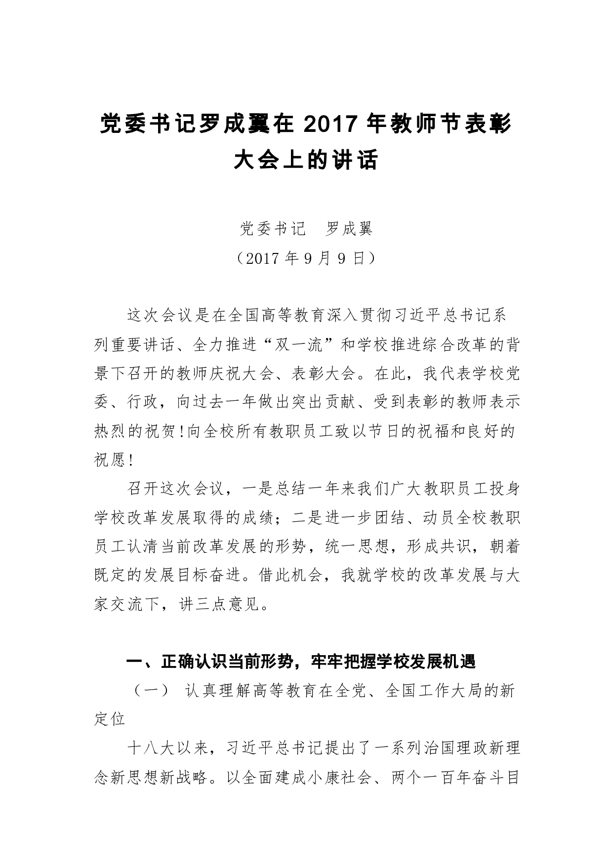 标题:教师节讲话:党委书记罗成翼在2017年教师节表彰大会上的讲话