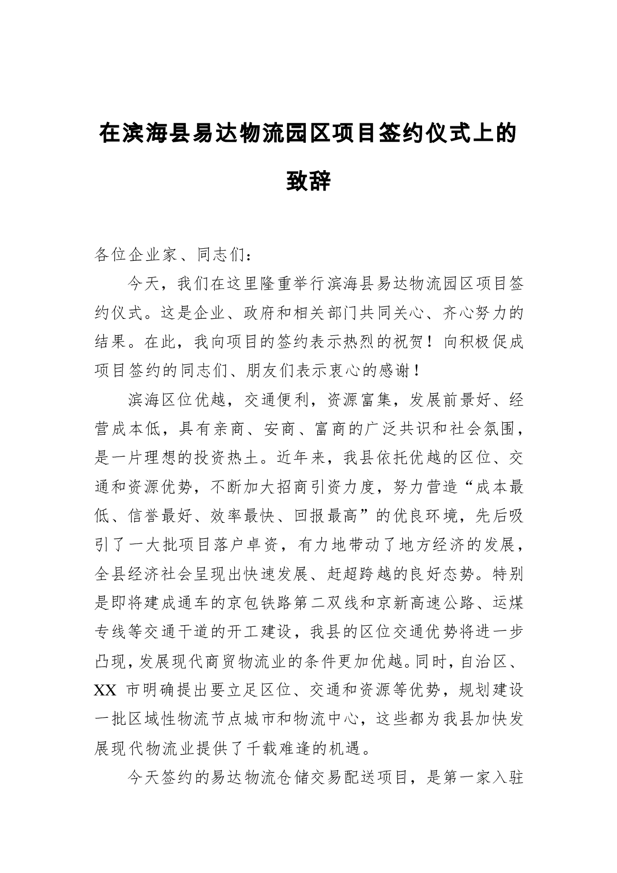 标题:在滨海县易达物流园区项目签约仪式上的致辞