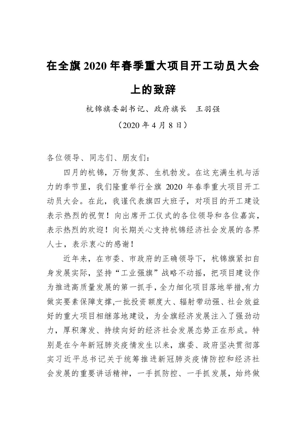标题:王羽强:在全旗2020年春季重大项目开工动员大会上的致辞