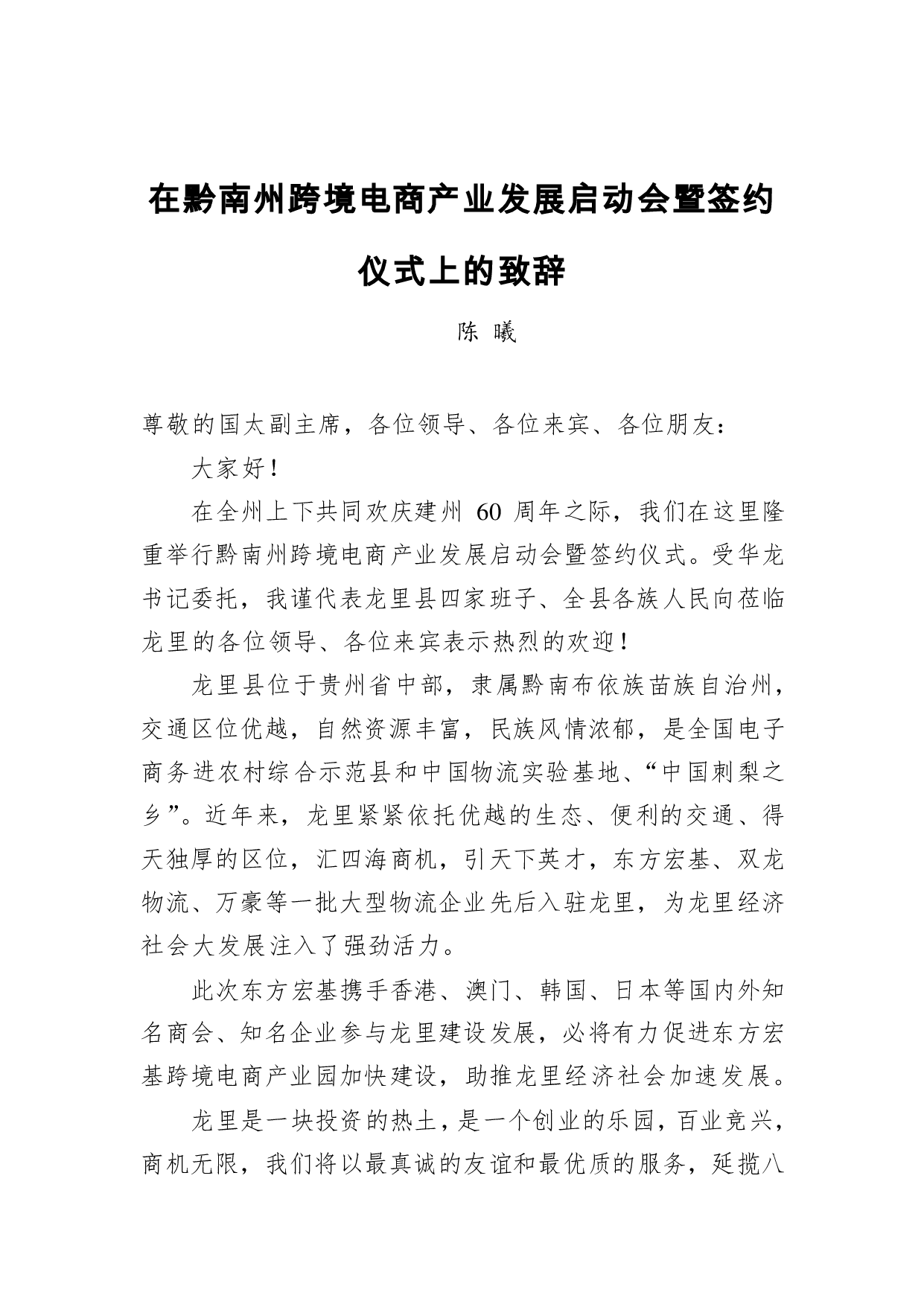 标题:在黔南州跨境电商产业发展启动会暨签约仪式上的致辞