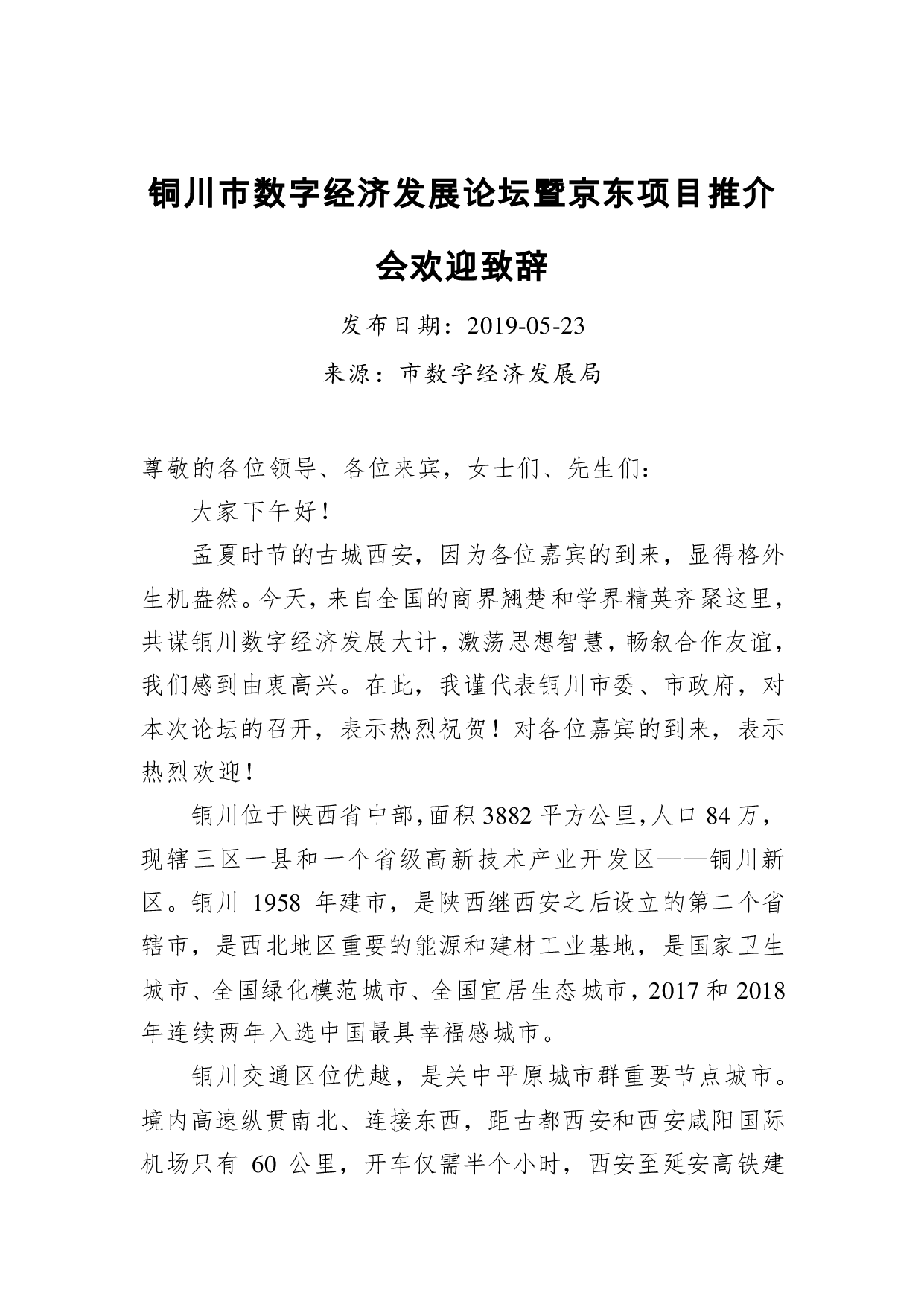 标题:铜川市数字经济发展论坛暨京东项目推介会欢迎致辞