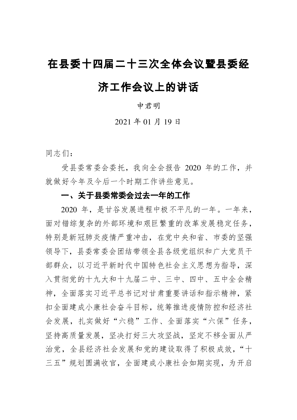 标题:在县委十四届二十三次全体会议暨县委经济工作会议上的讲话(2021年01月19日)