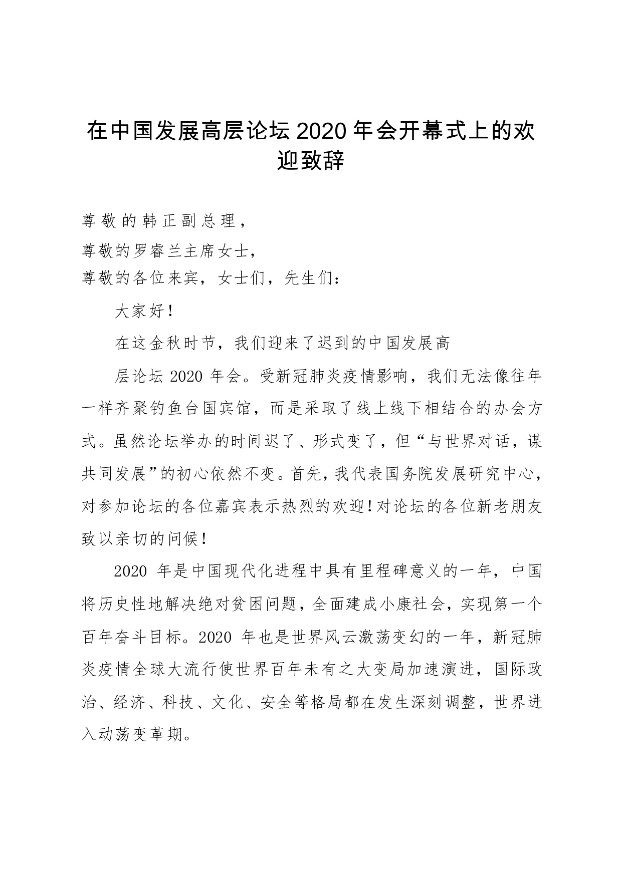 标题:国务院发展研究中心副主任马建堂在中国发展高层论坛2020年会开幕式上的欢迎致辞