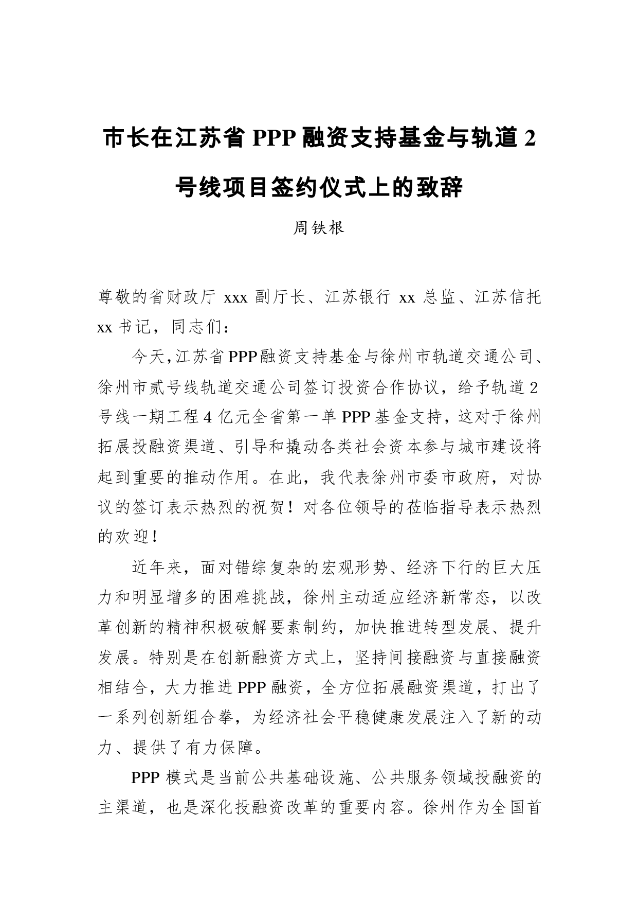 标题:市长在江苏省PPP融资支持基金与轨道2号线项目签约仪式上的致辞