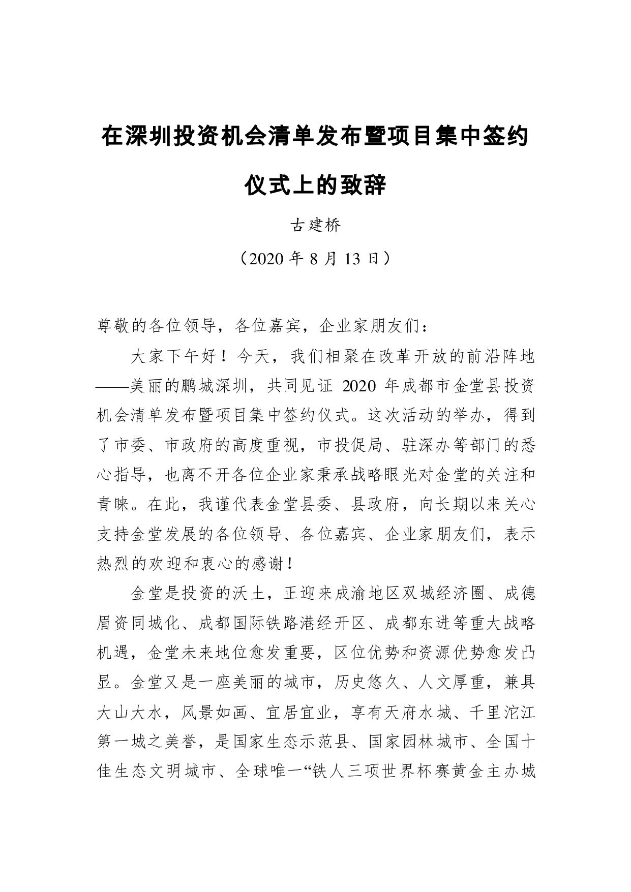 标题:在深圳投资机会清单发布暨项目集中签约仪式上的致辞