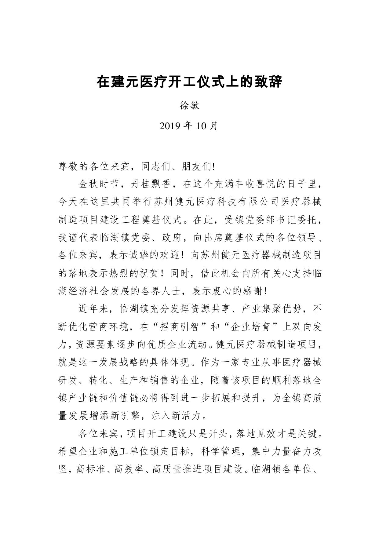 标题:徐敏:在建元医疗开工仪式上的致辞