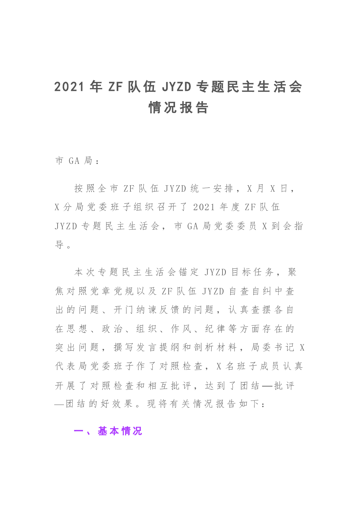 标题:2021年政法队伍教育整顿专题民主生活会情况总结报告20210421