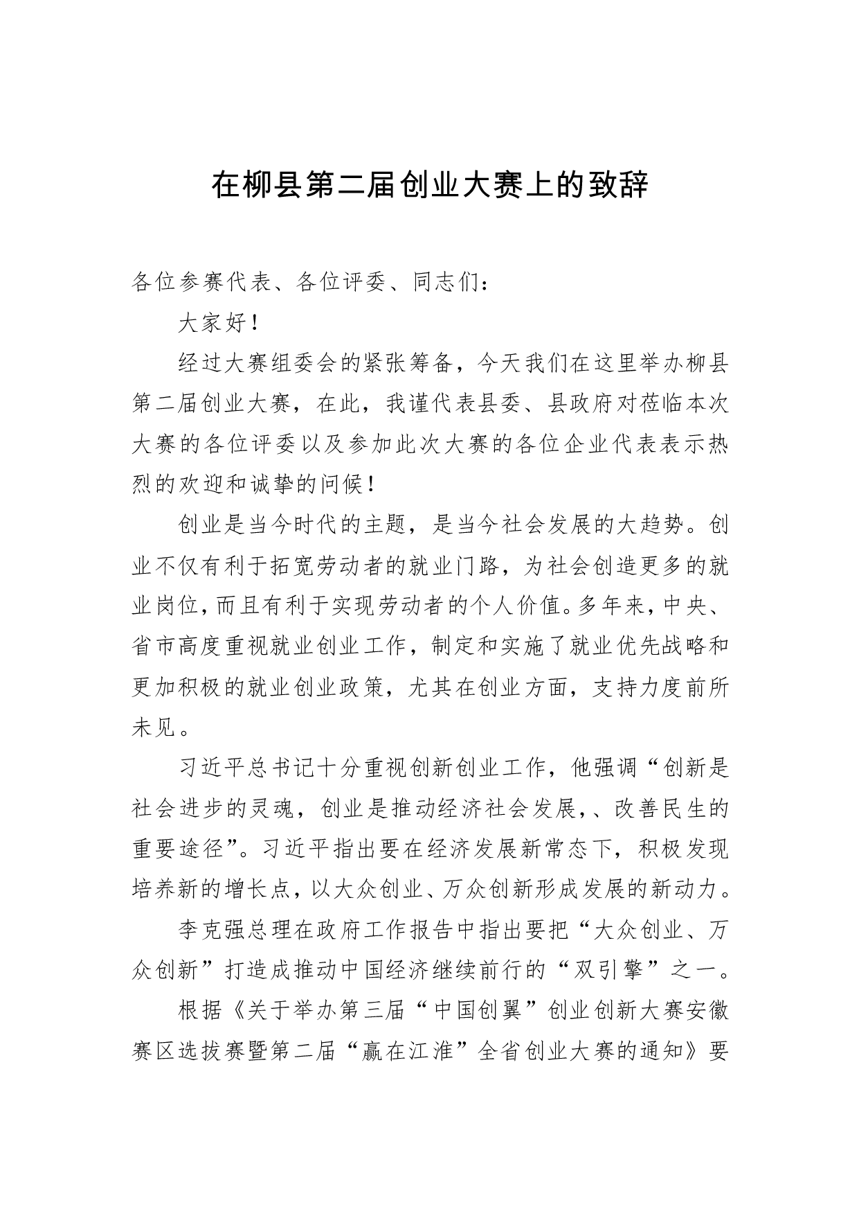 标题:在柳县第二届创业大赛上的致辞_转换