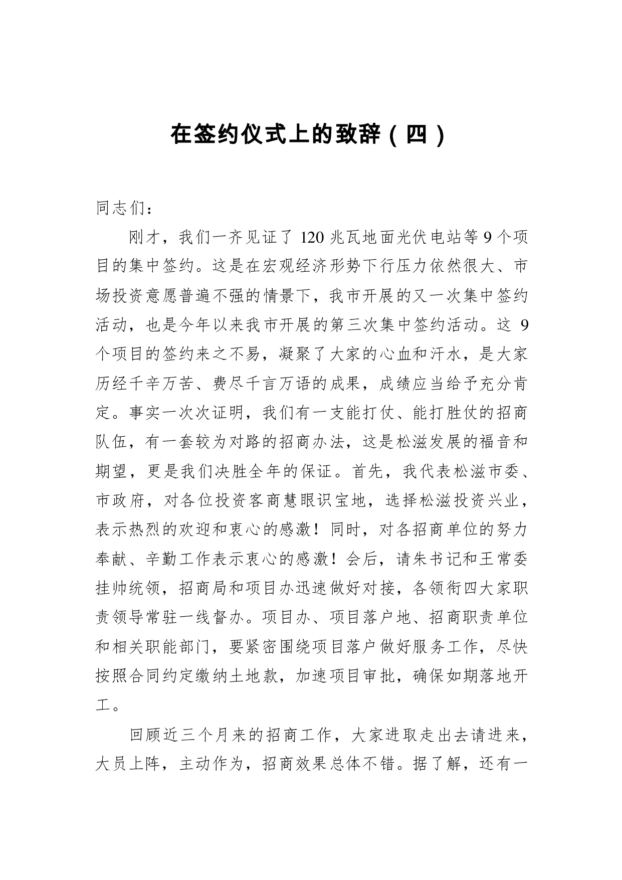 标题:在签约仪式上的致辞(四)