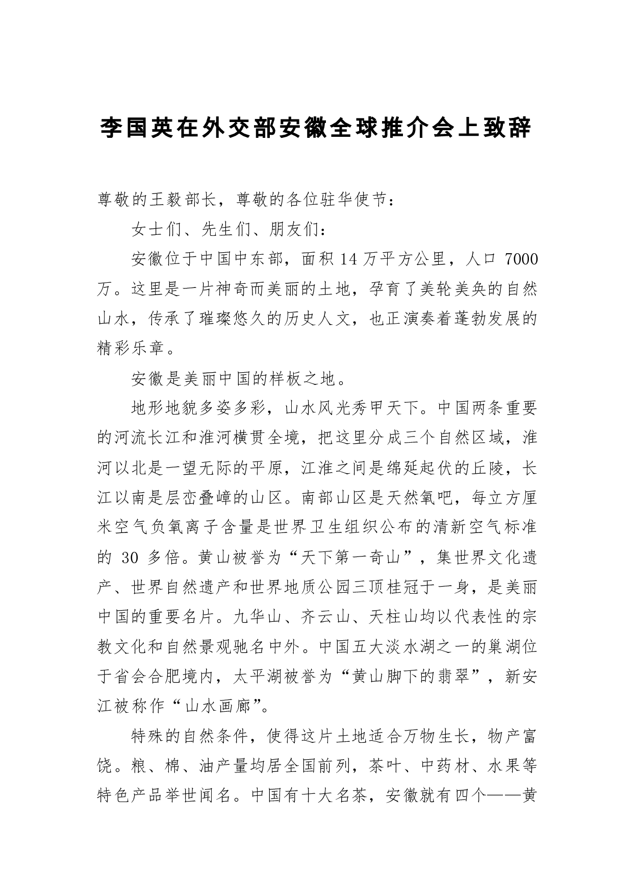 标题:李国英:在外交部安徽全球推介会上致辞