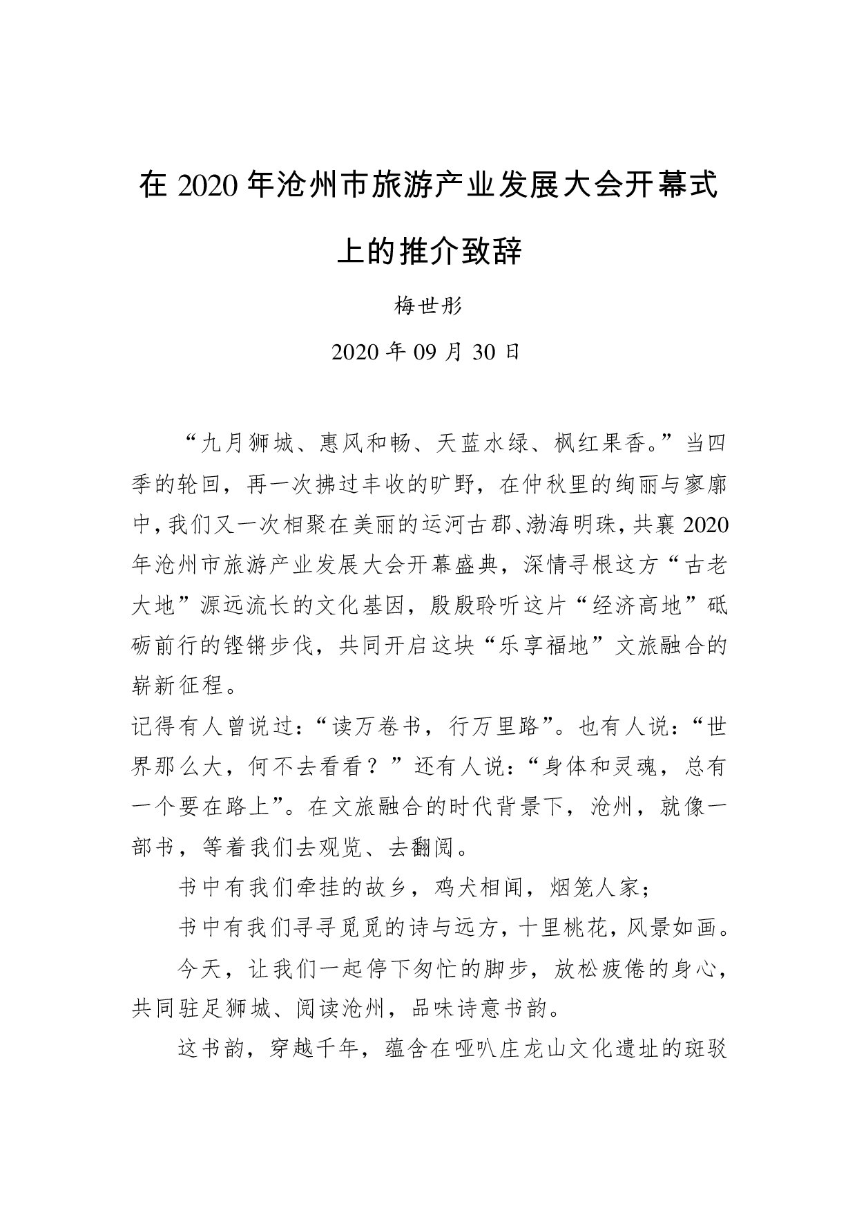 标题:梅世彤:在2020年沧州市旅游产业发展大会开幕式上的推介致辞(20200930)