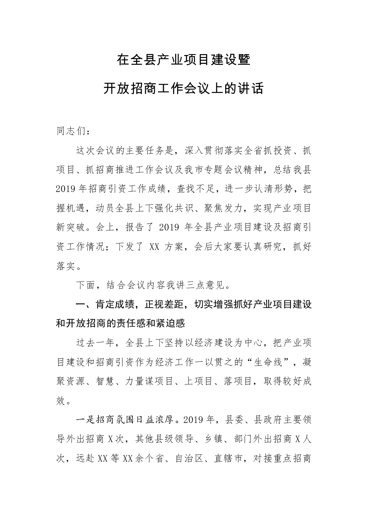 标题:在全县产业项目建设暨开放招商工作会议上的讲话
