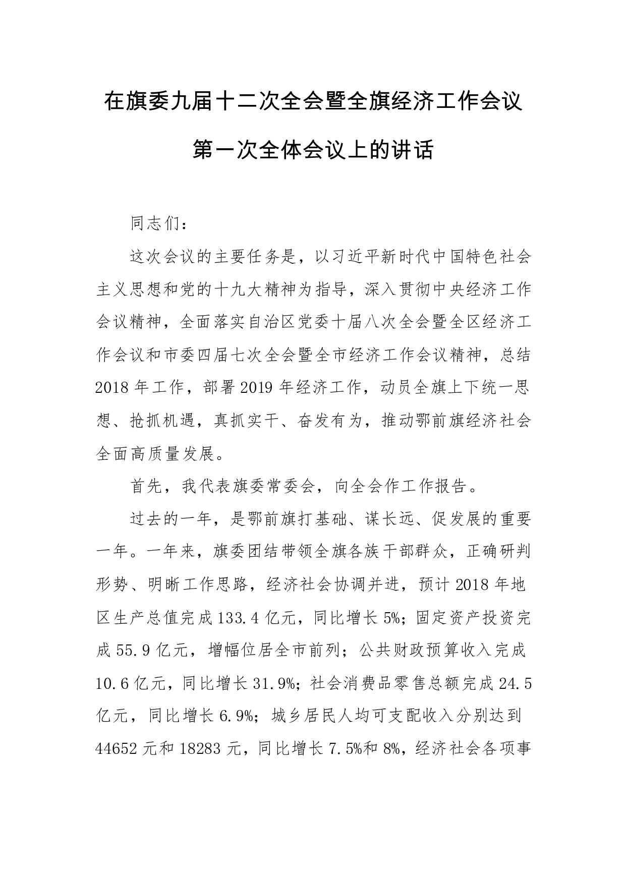 标题:在旗委九届十二次全会暨全旗经济工作会议第一次全体会议上的讲话