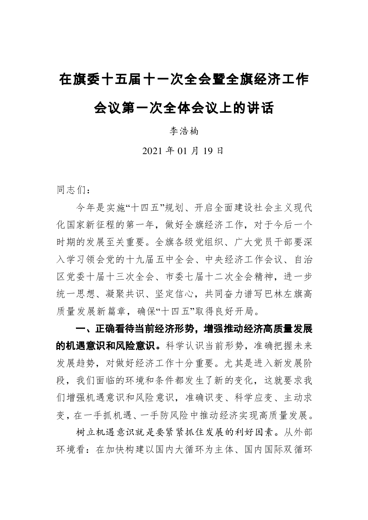 标题:李浩楠:在旗委十五届十一次全会暨全旗经济工作会议第一次全体会议上的讲话