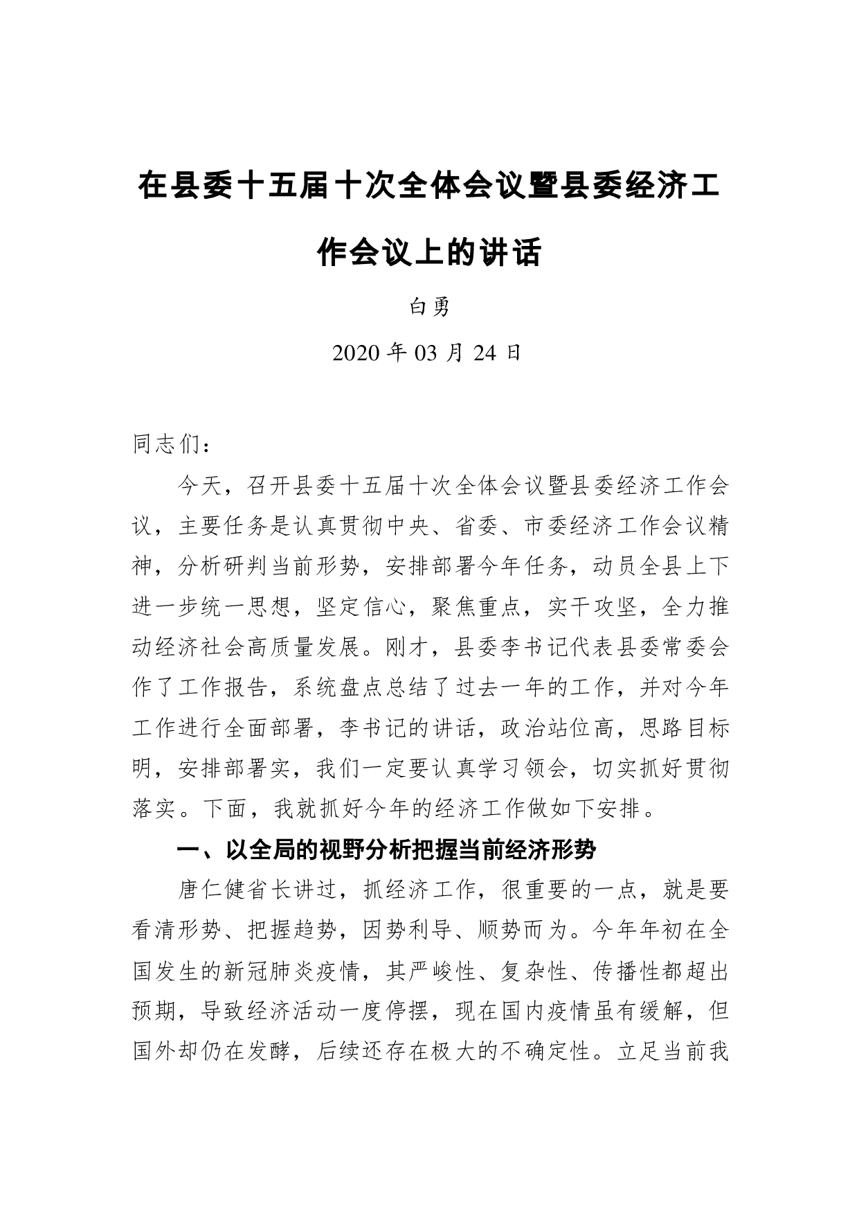 标题:白勇:在县委十五届十次全体会议暨县委经济工作会议上的讲话