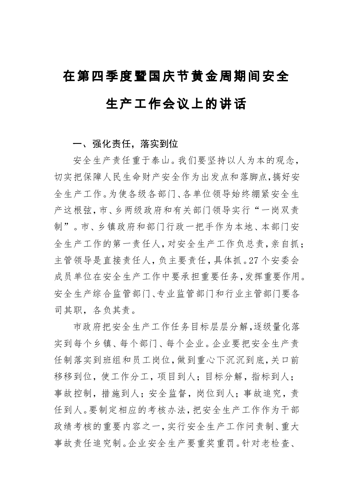 标题:在第四季度暨国庆节黄金周期间安全生产工作会议上的讲话