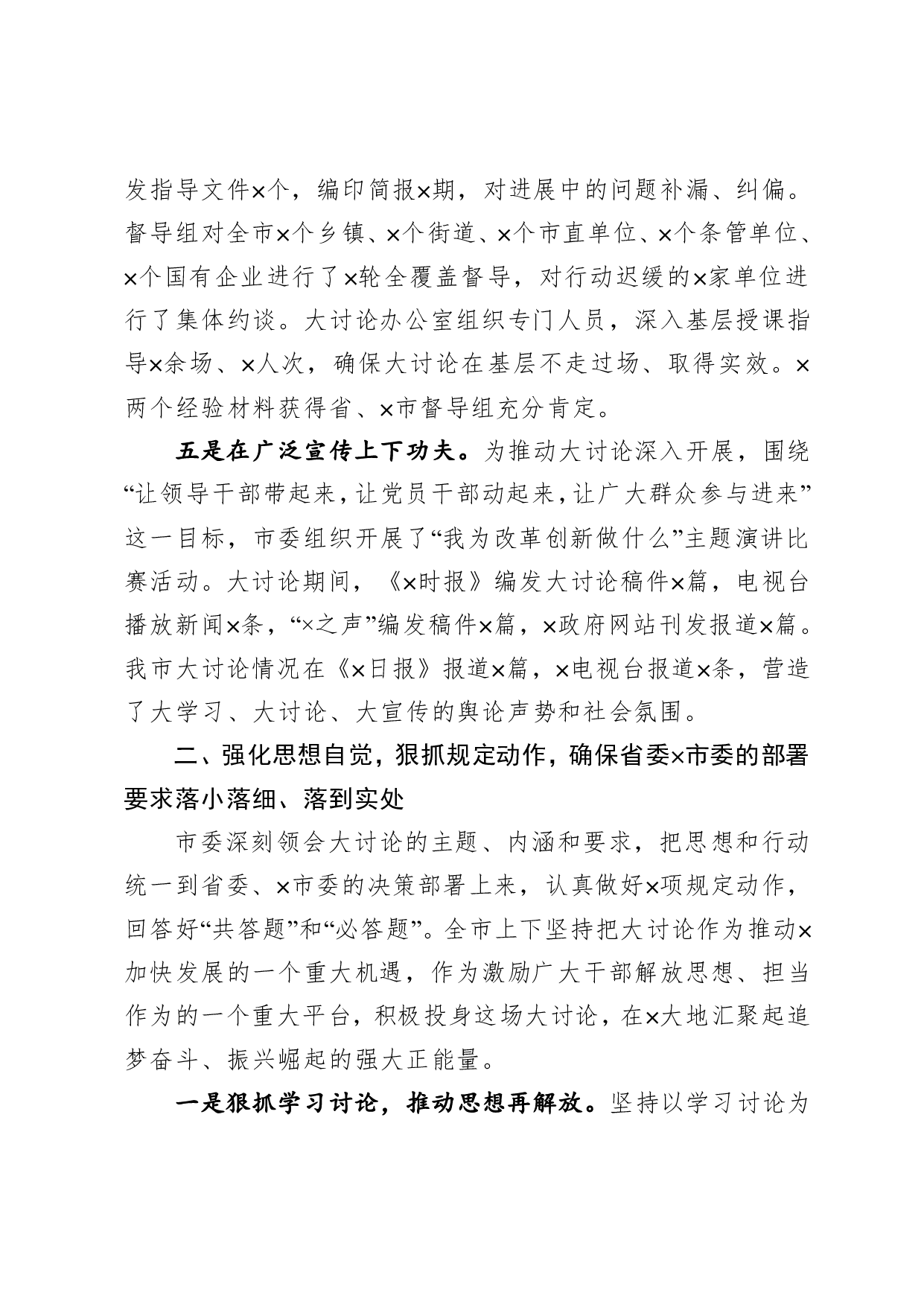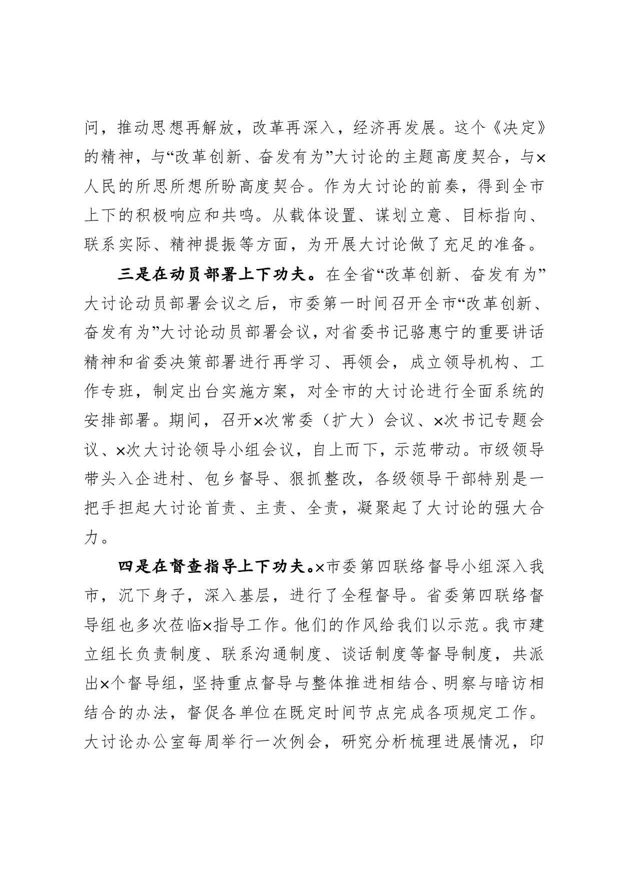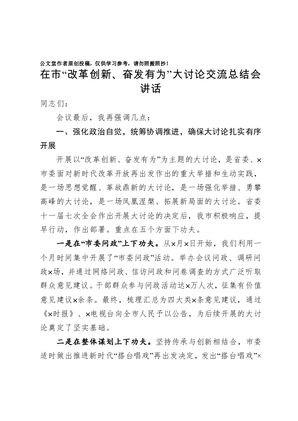 标题:在市改革创新奋发有为大讨论交流总结会讲话