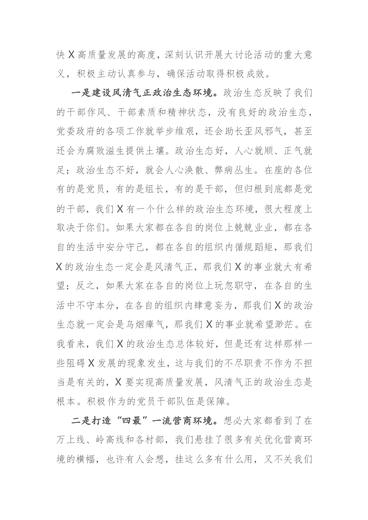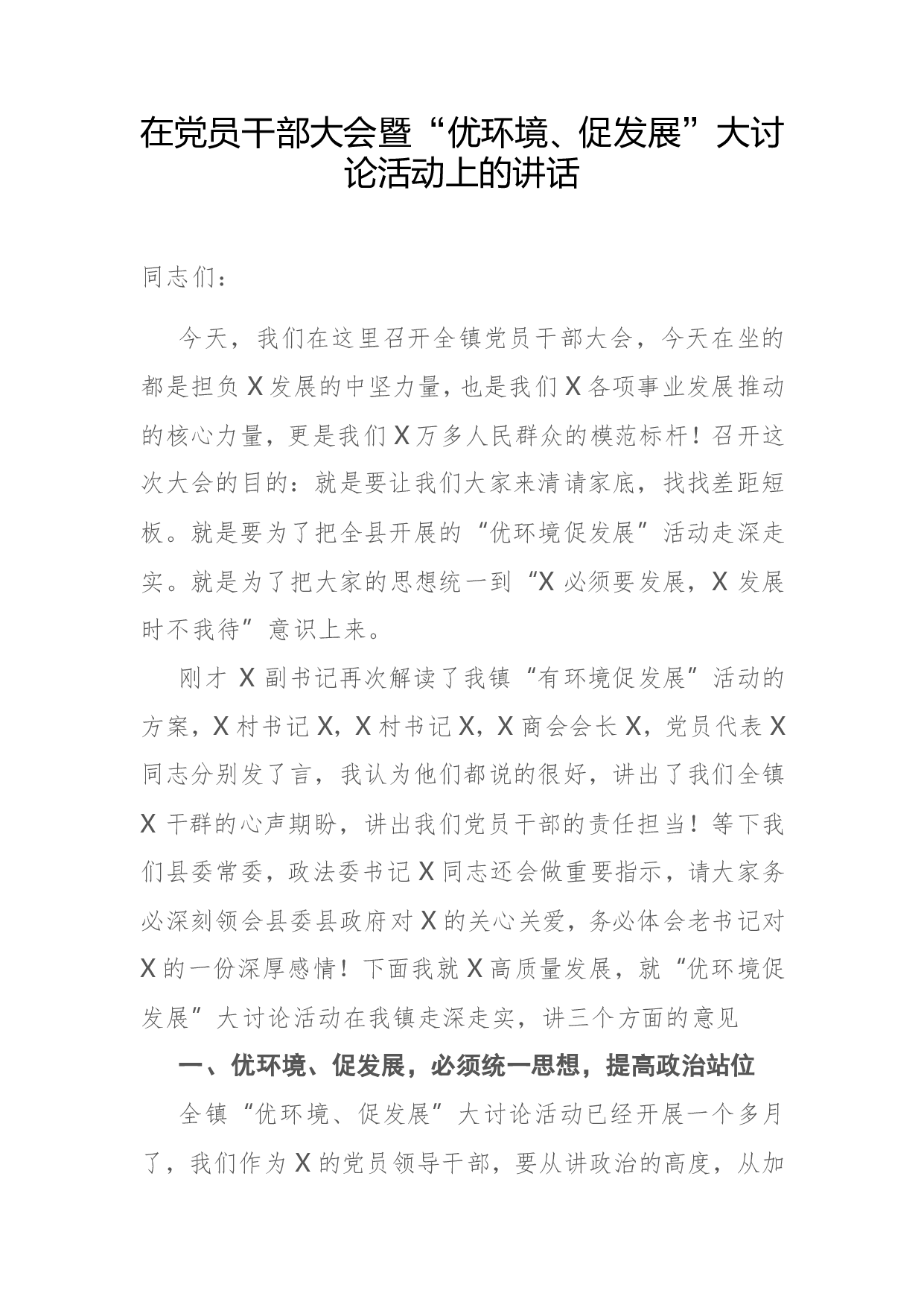 标题:在党员干部大会暨“优环境、促发展”大讨论活动上的讲话