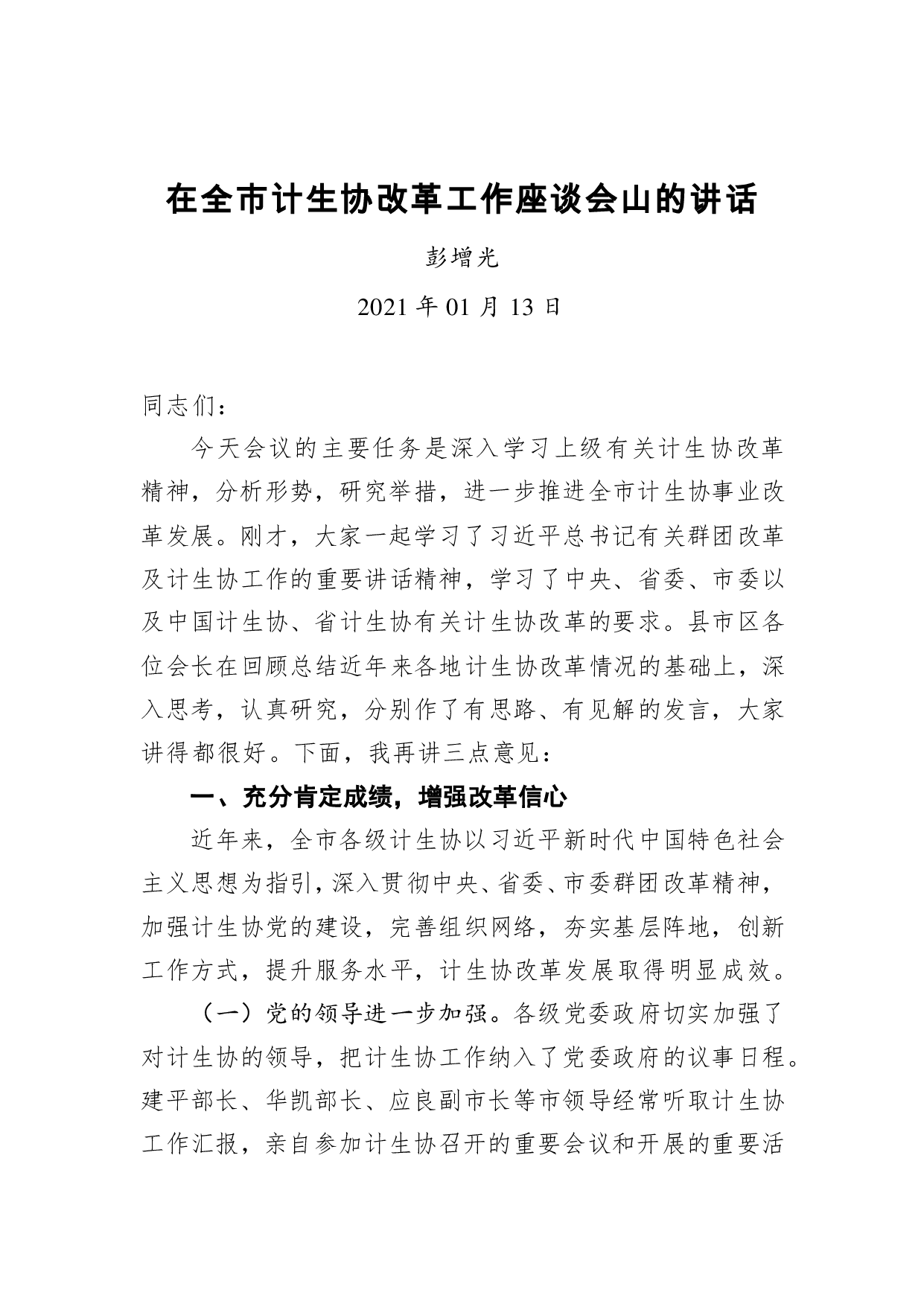 标题:彭增光:在全市计生协改革工作座谈会山的讲话(20210113)