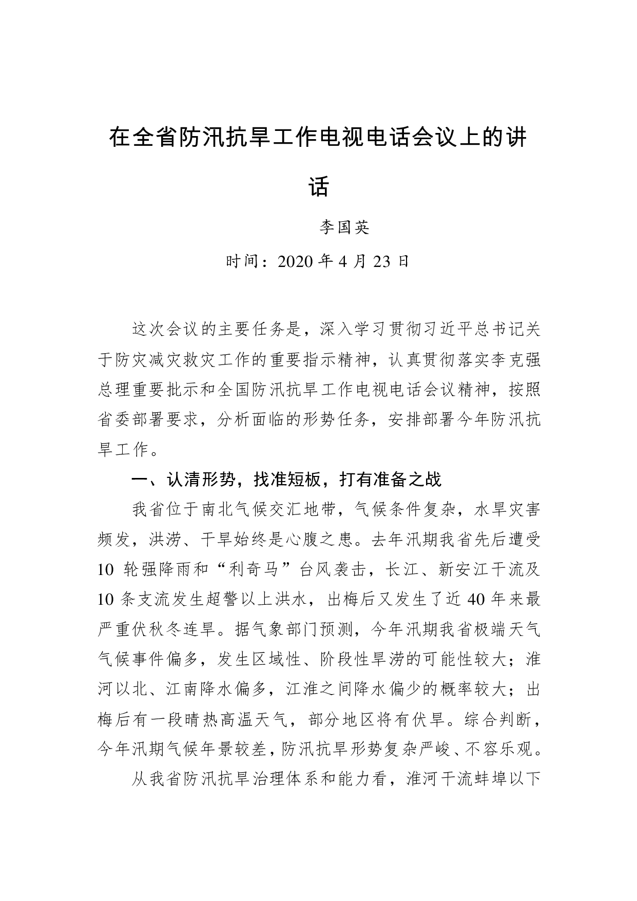 标题:李国英:在全省防汛抗旱工作电视电话会议上的讲话