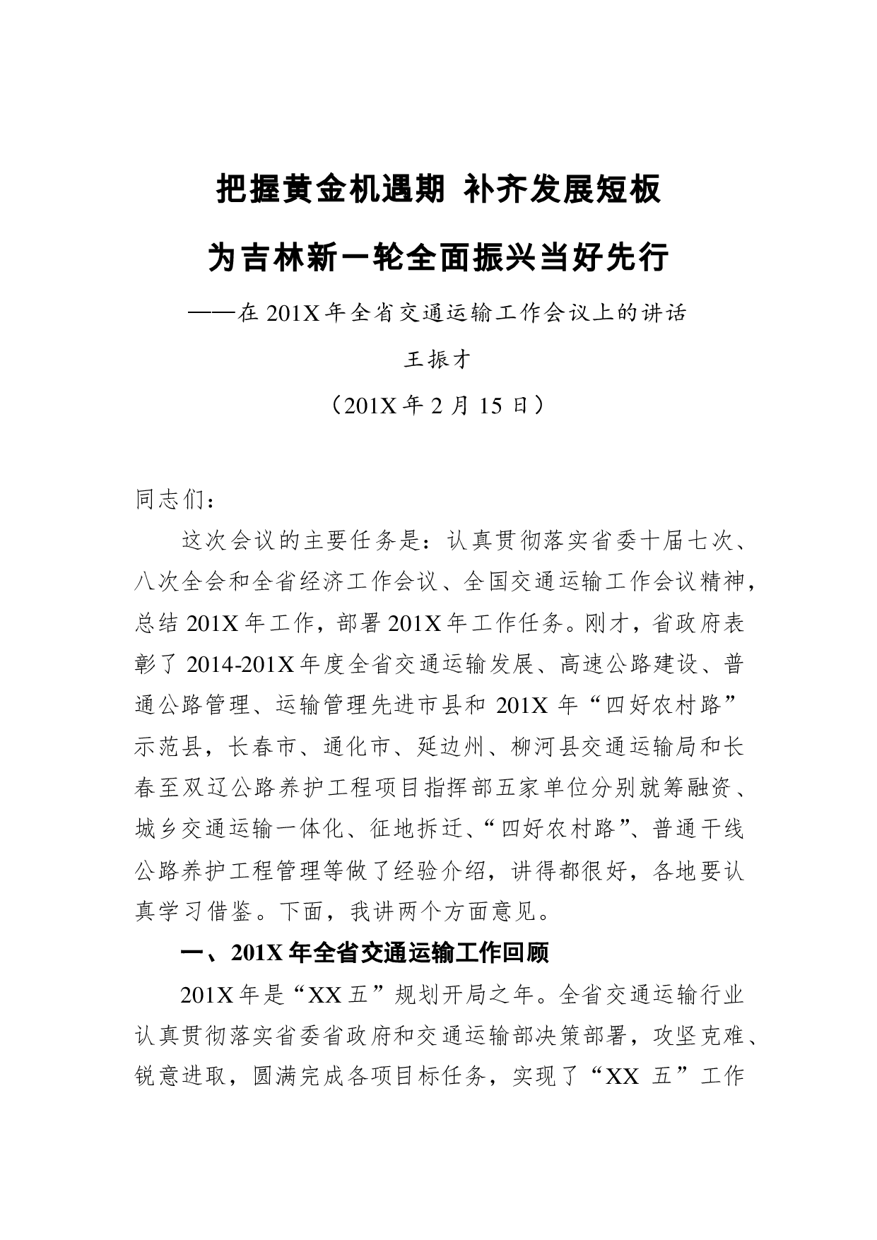 标题:王振才:把握黄金机遇期 补齐发展短板 为吉林新一轮全面振兴当好先行——在全省交通运输工