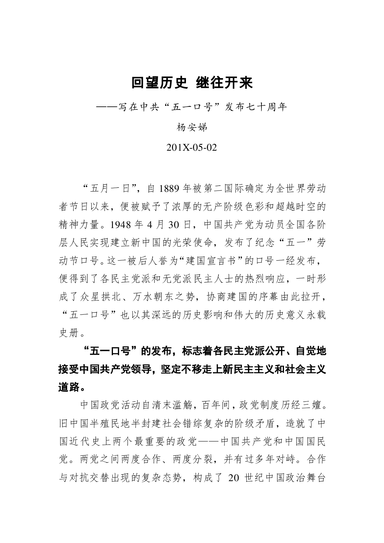 标题:杨安娣:回望历史 继往开来——写在中共“五一口号”发布七十周年