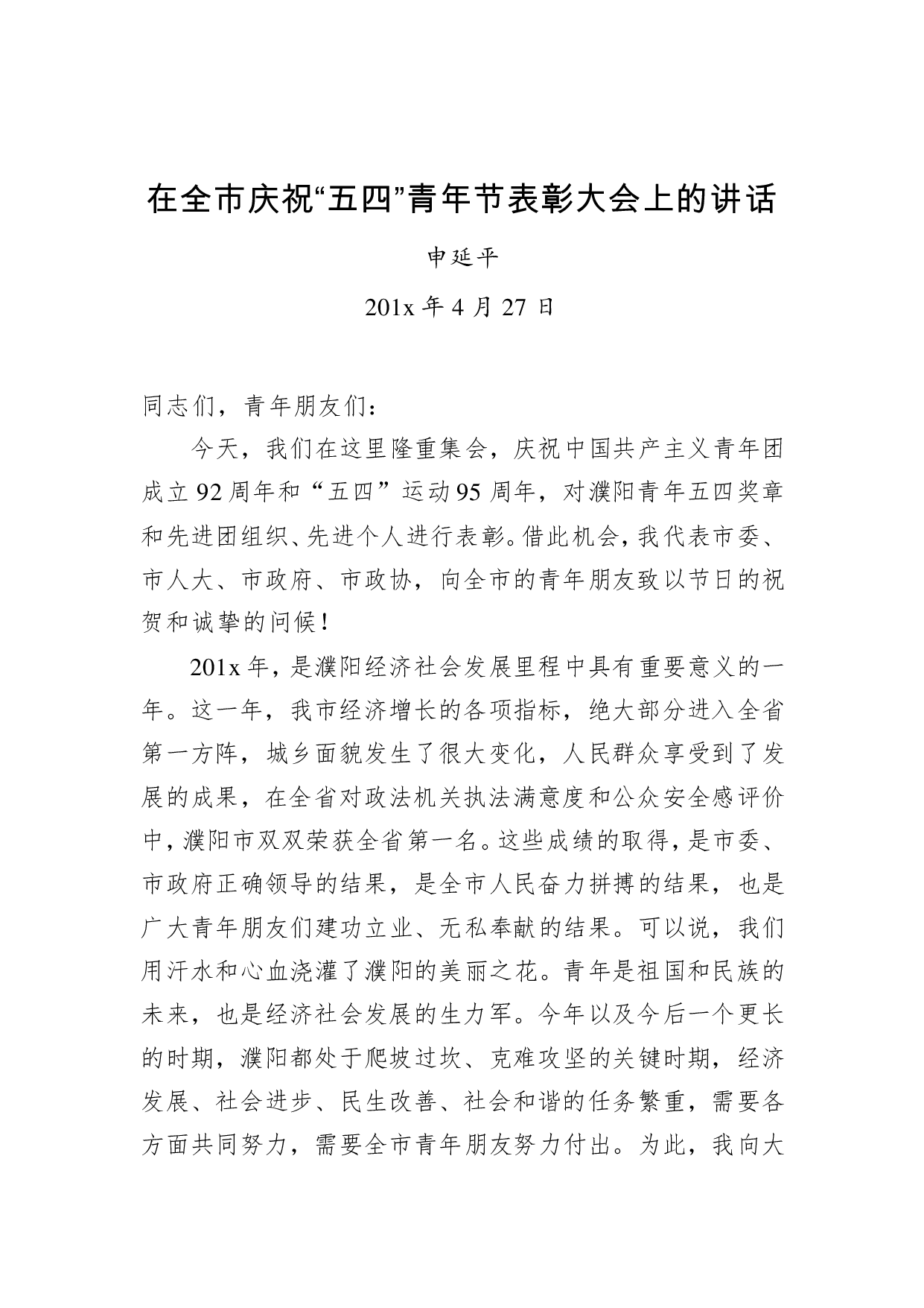 标题:申延平:在全市庆祝“五四”青年节表彰大会上的讲话
