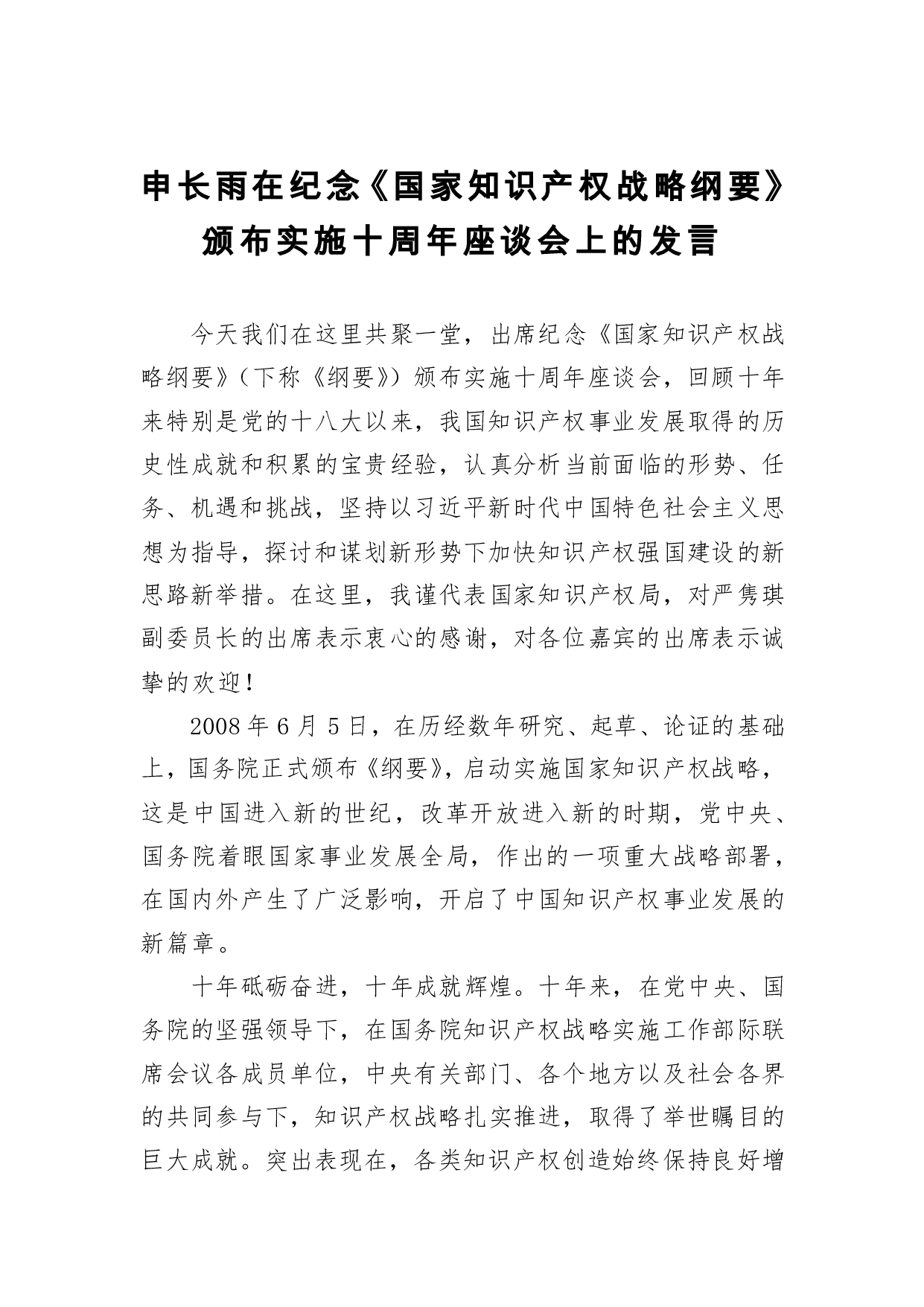 标题:国家知识产权局局长申长雨:在纪念《国家知识产权战略纲要》颁布实施十周年座谈会上的发