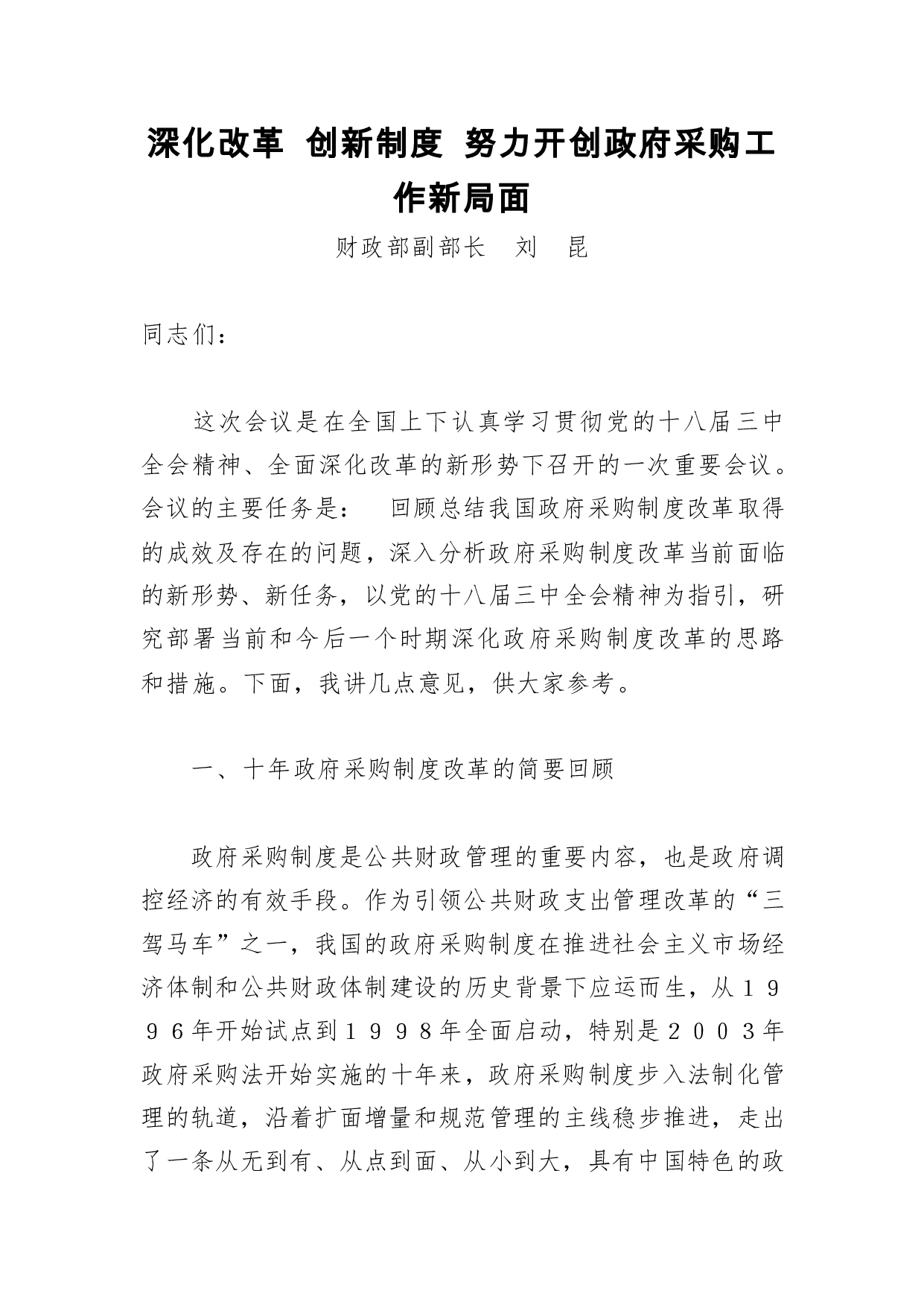 标题:刘昆:深化改革创新制度努力开创政府采购工作新局面