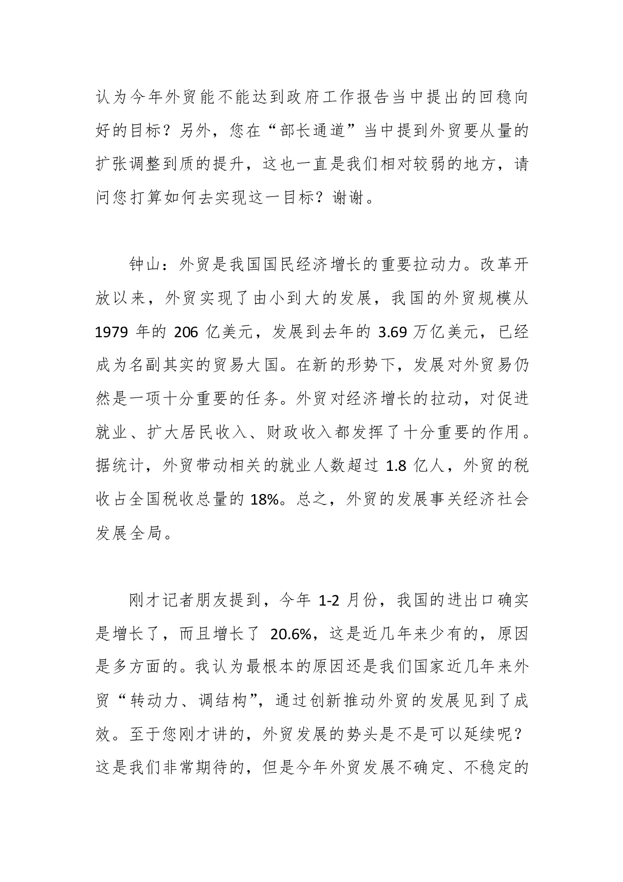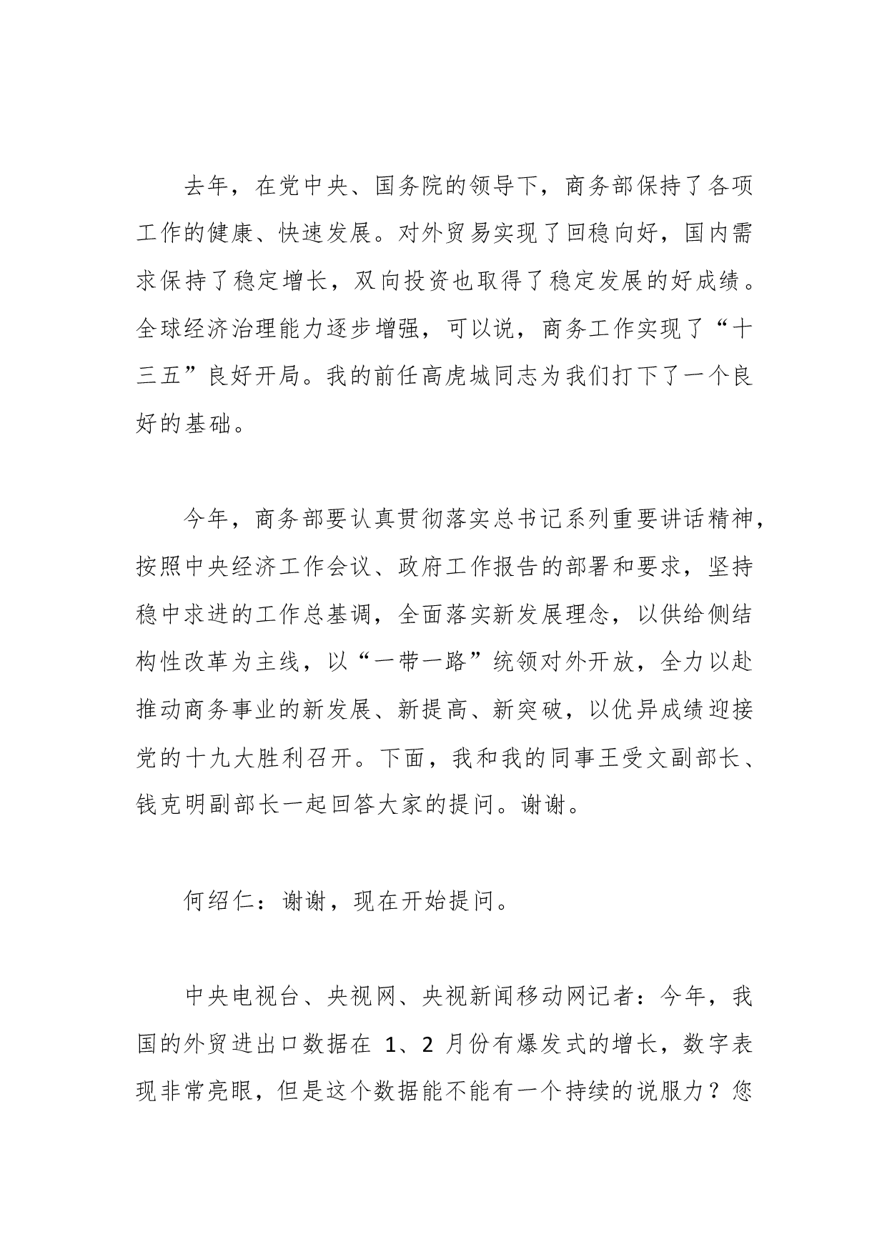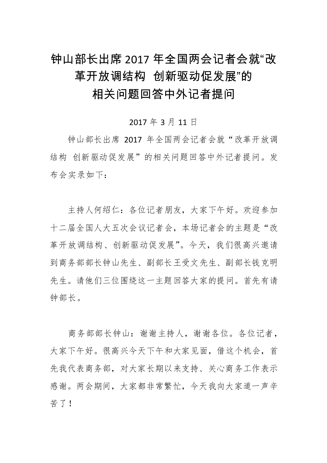 标题:钟山部长出席2017年全国两会记者会就“改革开放调结构创新驱动促发展”的相关问题回答中外
