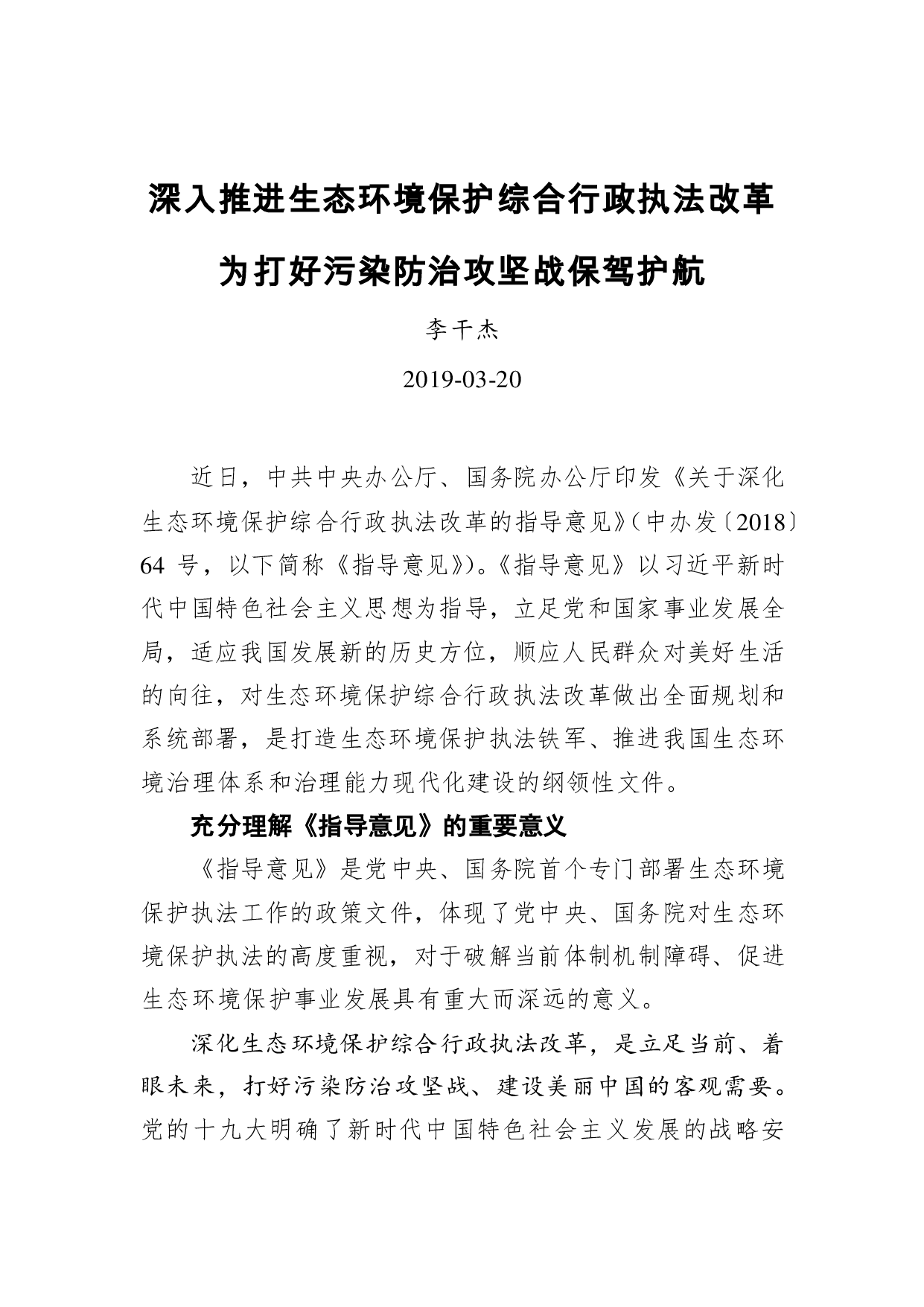 标题:李干杰:深入推进生态环境保护综合行政执法改革 为打好污染防治攻坚战保驾护航