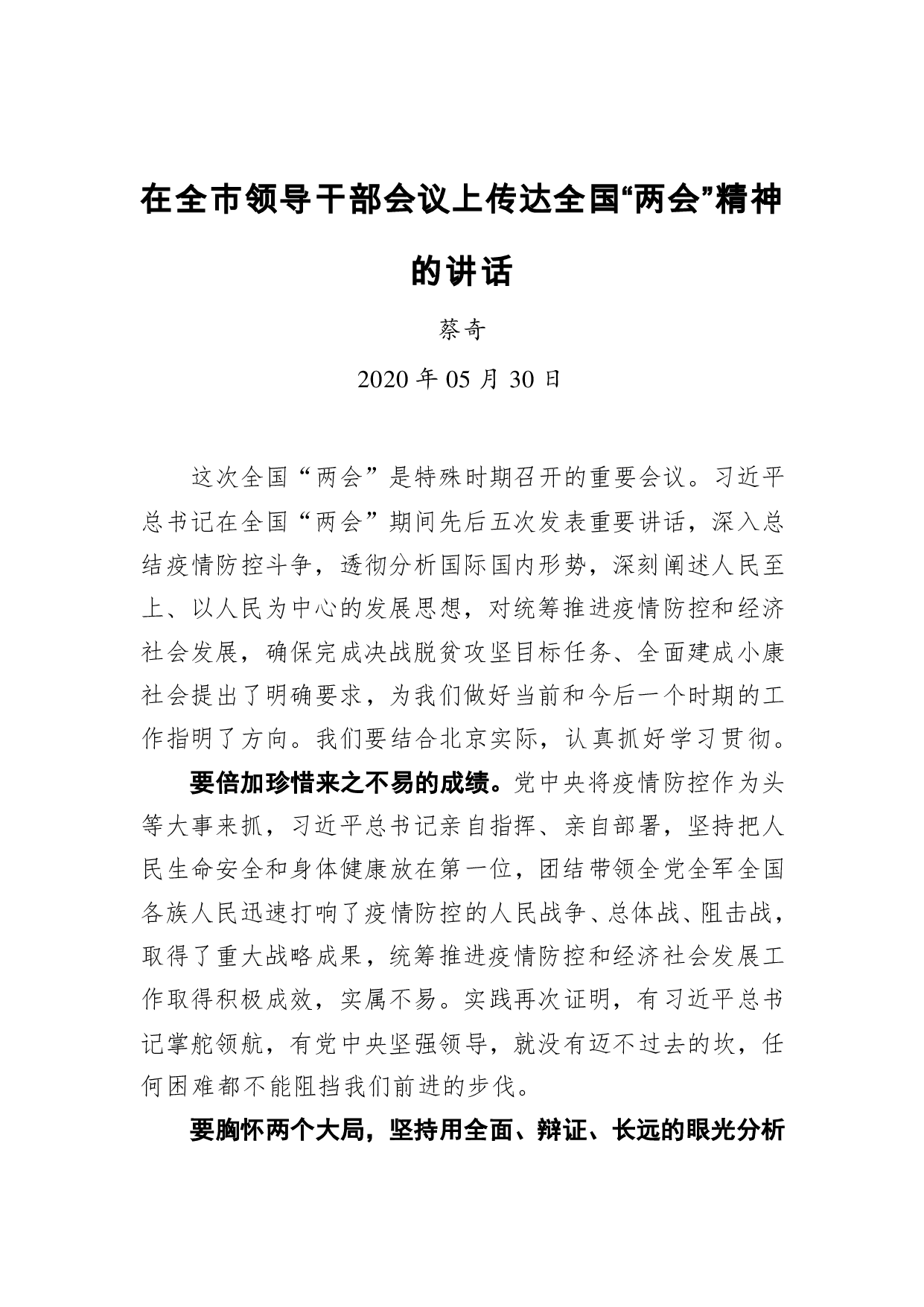 标题:蔡奇:在全市领导干部会议上传达全国“两会”精神的讲话