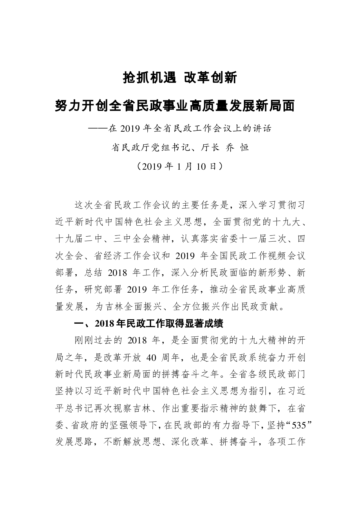 标题:乔恒:抢抓机遇 改革创新 努力开创全省民政事业高质量发展新局面——在2019年全省民政工作