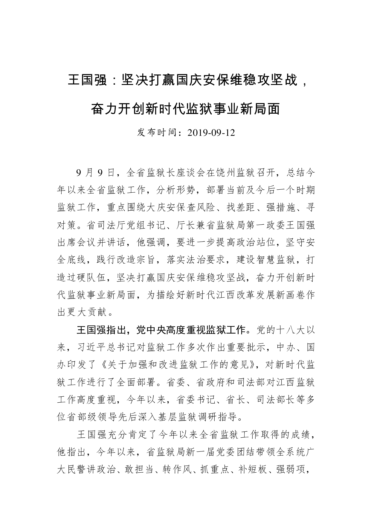 标题:王国强:坚决打赢国庆安保维稳攻坚战,奋力开创新时代监狱事业新局面