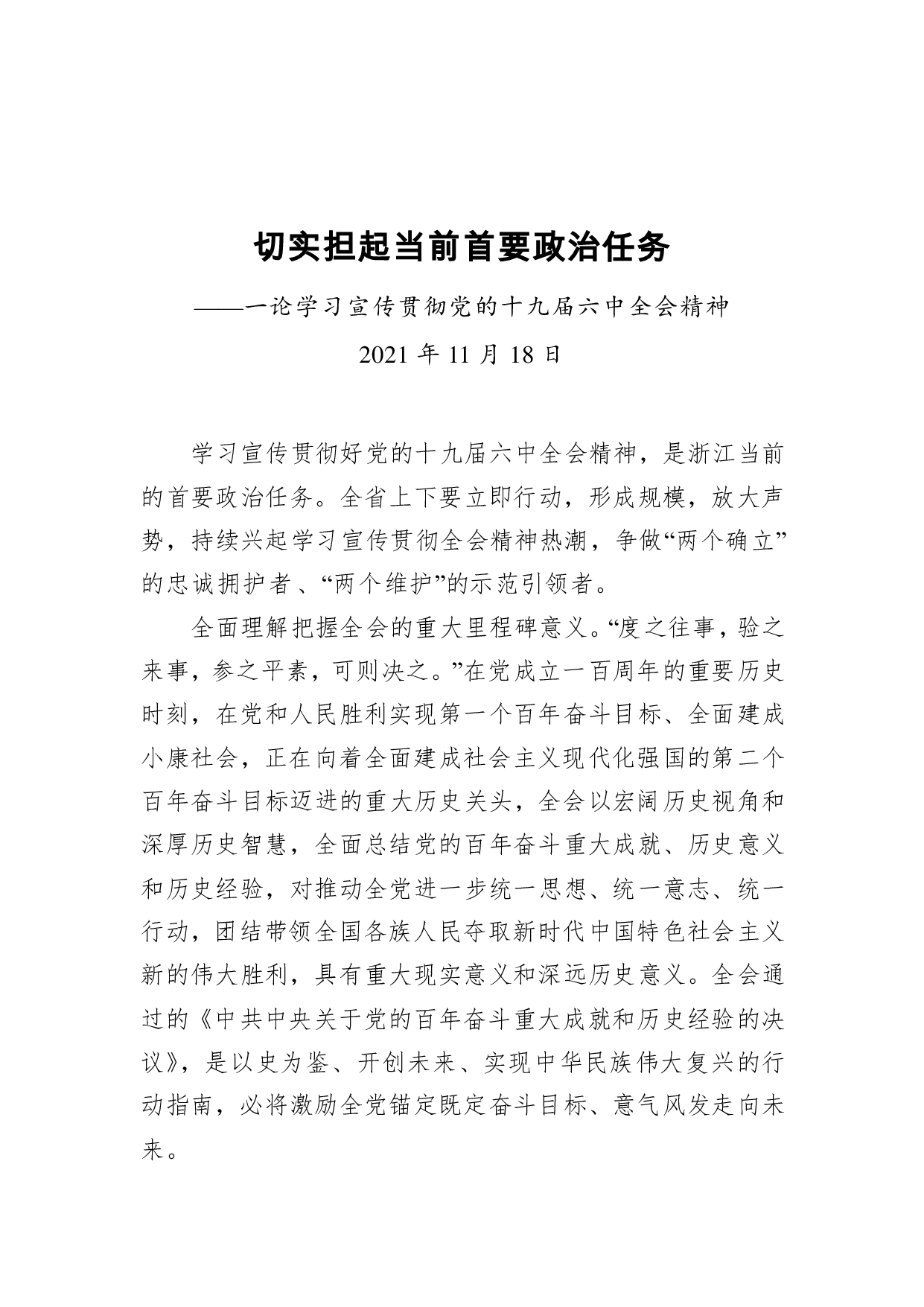 标题:切实担起当前首要政治任务——一论学习宣传贯彻党的十九届六中全会精神