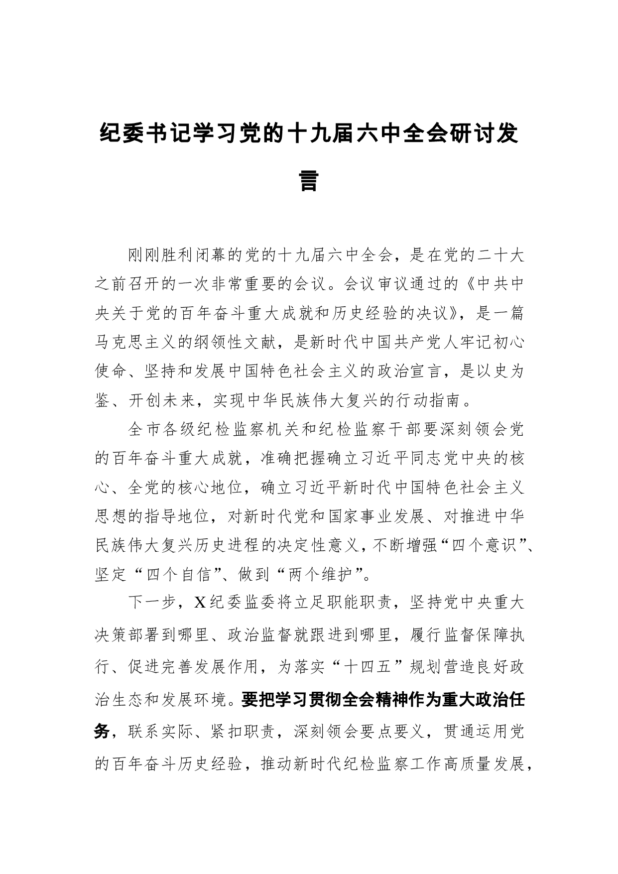 标题:纪委书记学习党的十九届六中全会研讨发言
