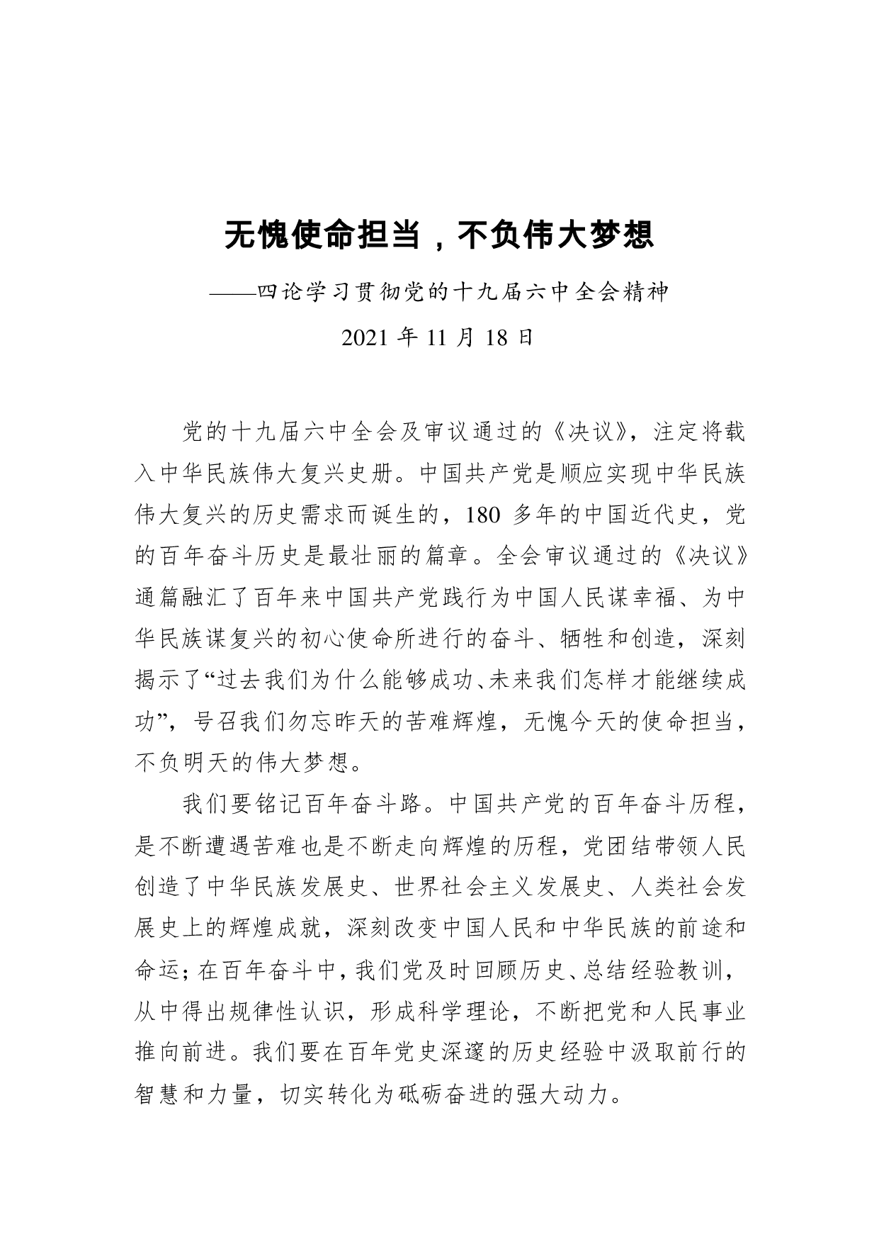 标题:无愧使命担当,不负伟大梦想——四论学习贯彻党的十九届六中全会精神