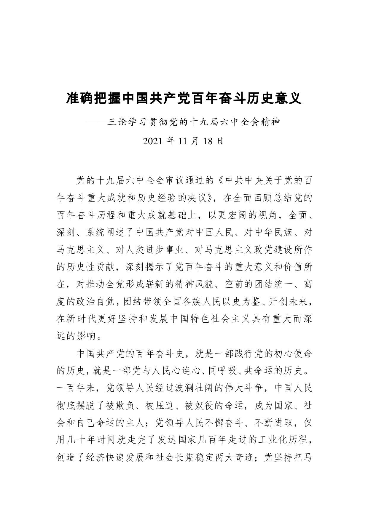 标题:准确把握中国共产党百年奋斗历史意义——三论学习贯彻党的十九届六中全会精神