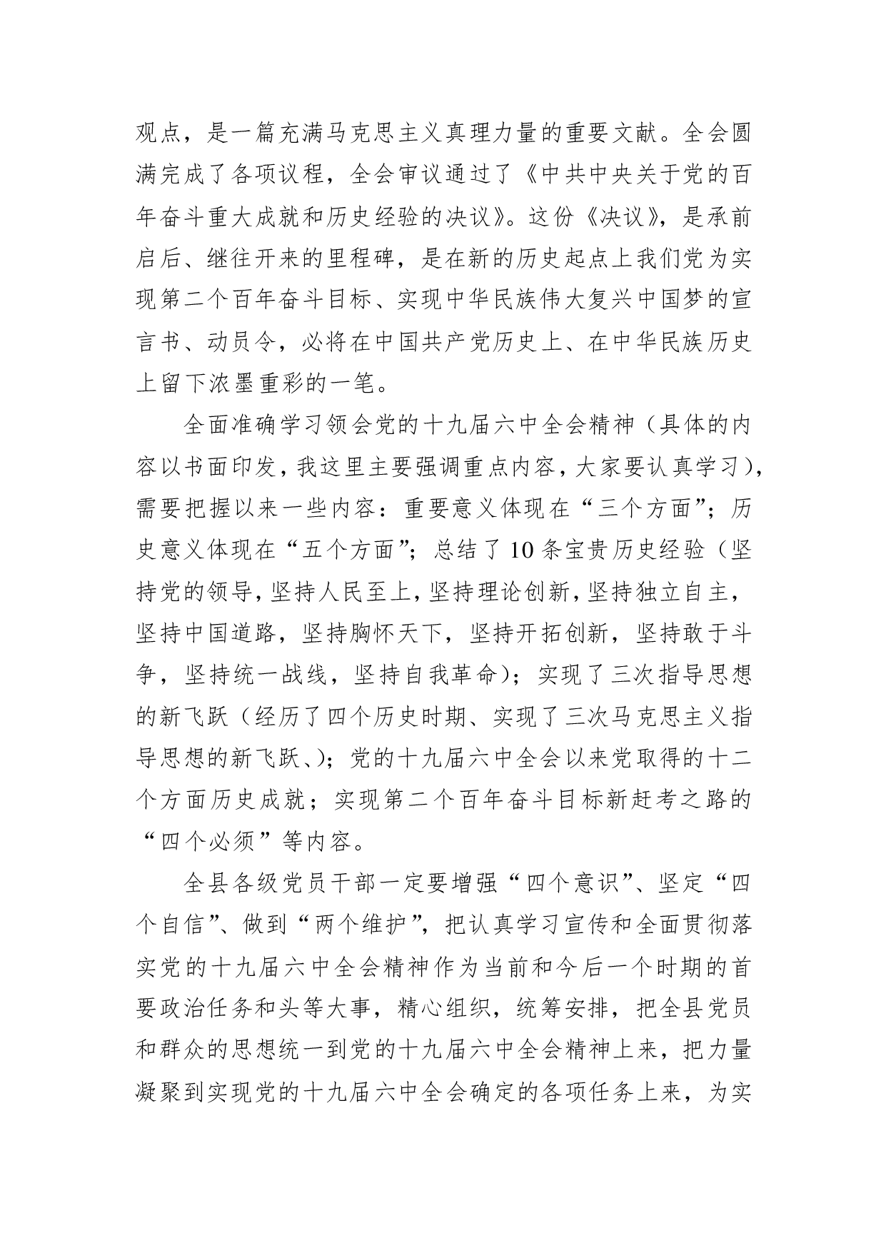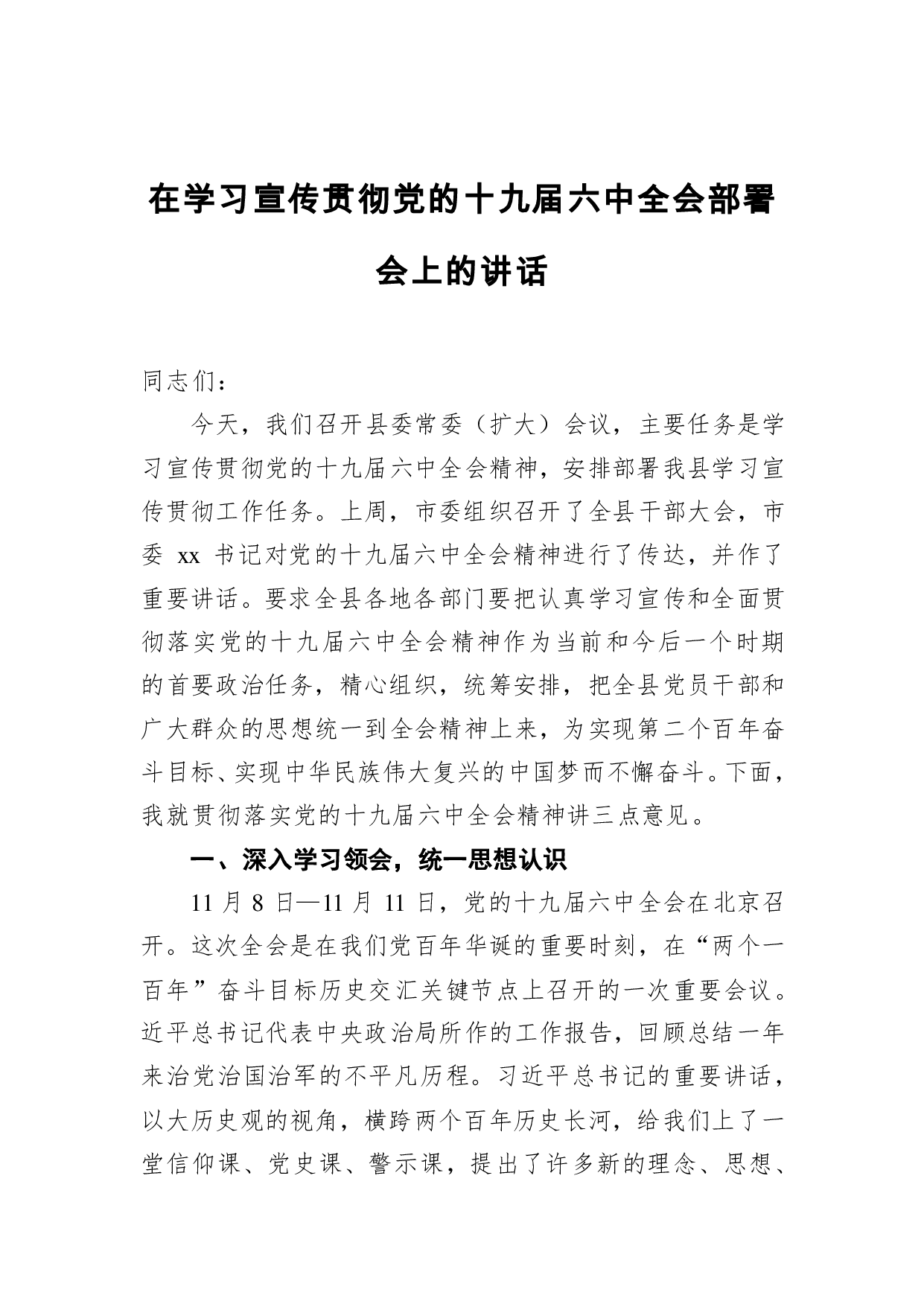 标题:在学习宣传贯彻党的十九届六中全会部署会上的讲话