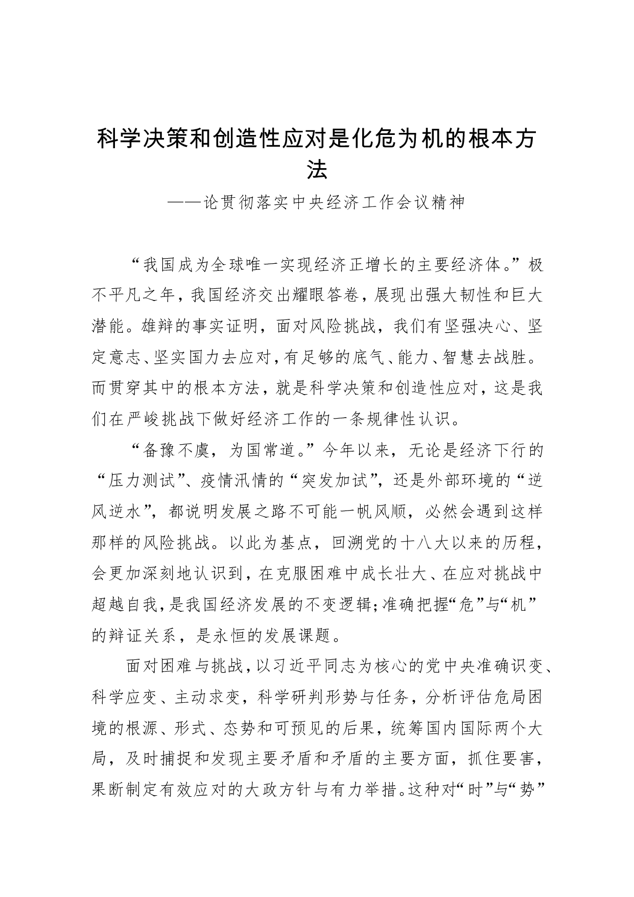 标题:【论贯彻落实中央经济工作会议精神】科学决策和创造性应对是化危为机的根本方法