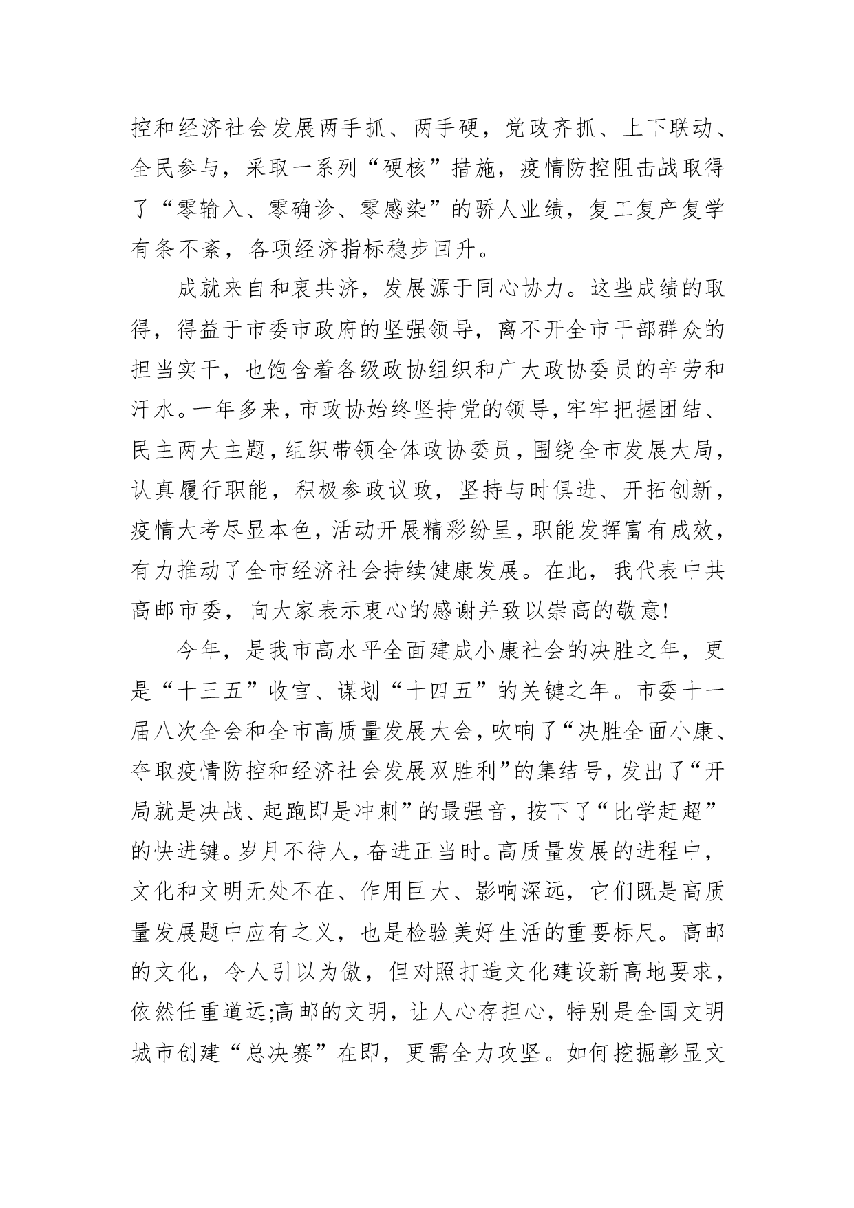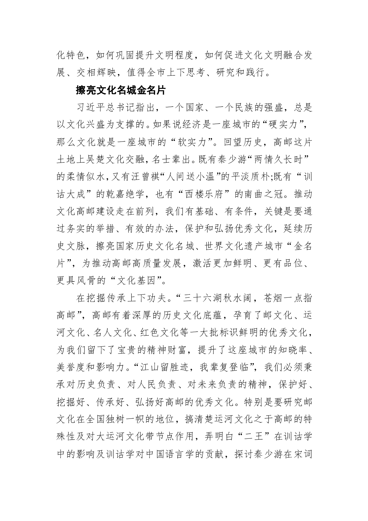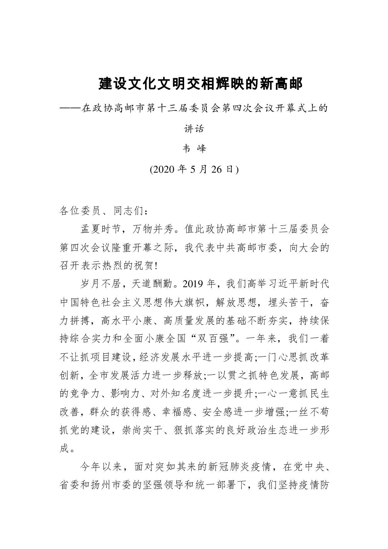 标题:韦峰:建设文化文明交相辉映的新高邮——在政协高邮市第十三届委员会第四次会议开幕式上