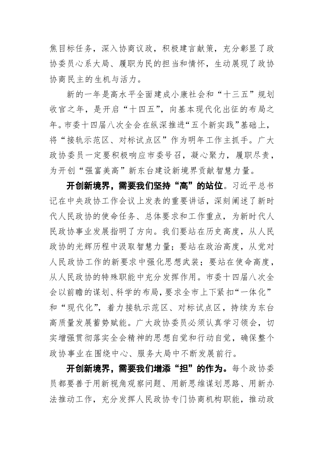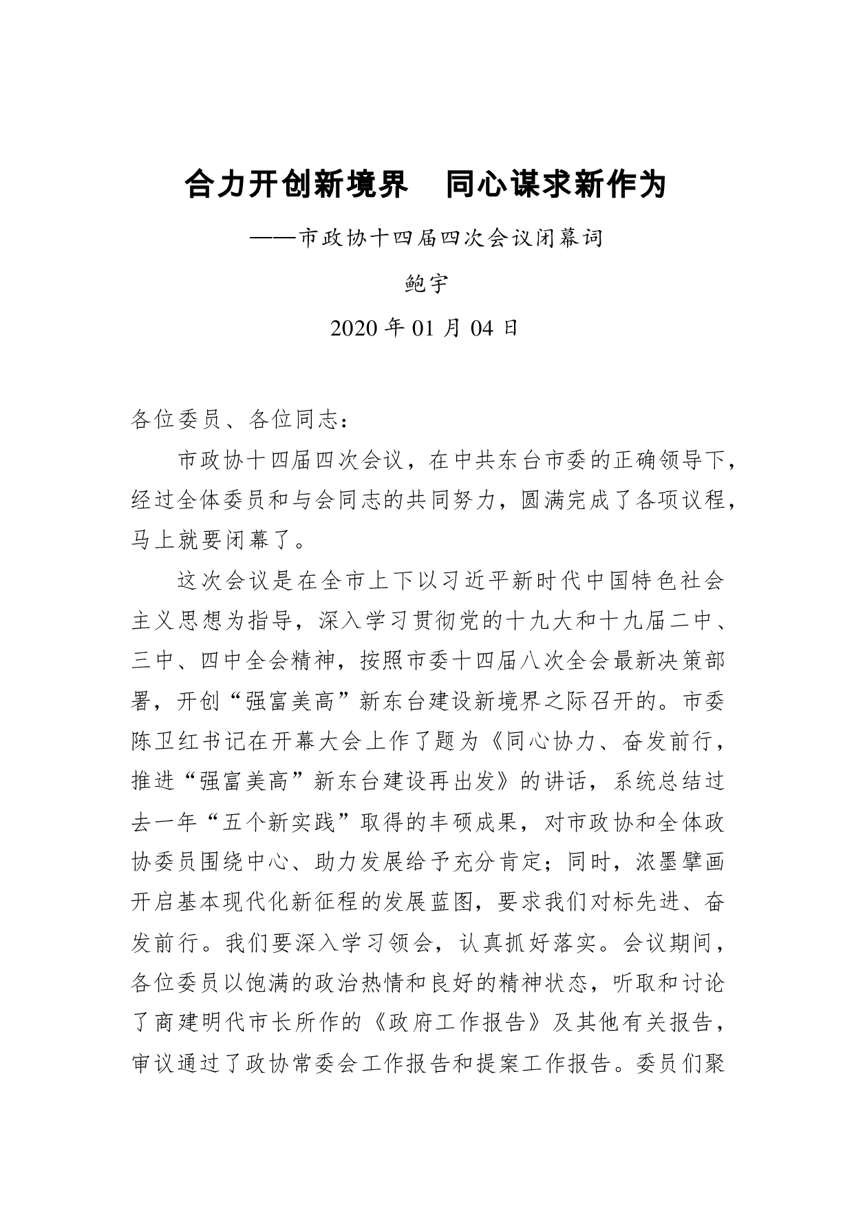 标题:鲍宇:合力开创新境界 同心谋求新作为——市政协十四届四次会议闭幕词
