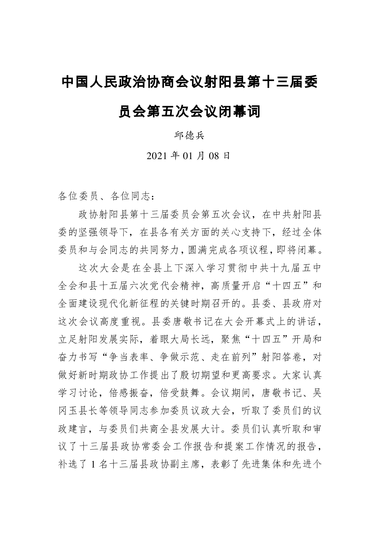 标题:邱德兵:中国人民政治协商会议射阳县第十三届委员会第五次会议闭幕词(20210108)