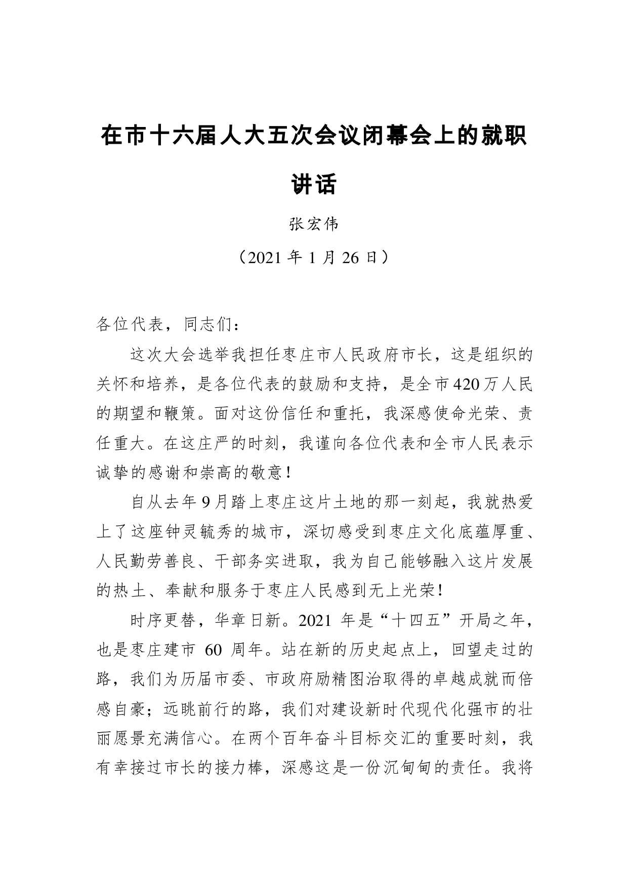标题:张宏伟:在市十六届人大五次会议闭幕会上的就职讲话(20210126)