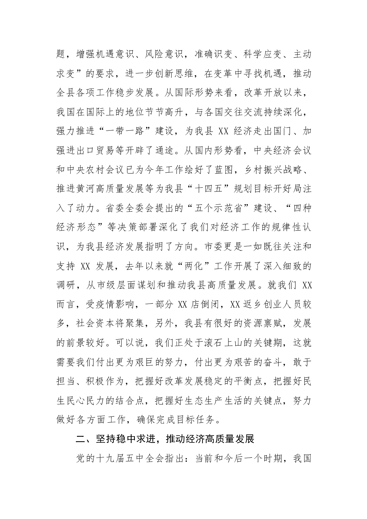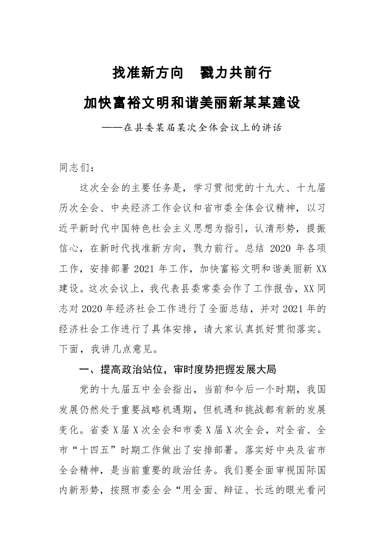 标题:在县委某届某次全体会议上的讲话